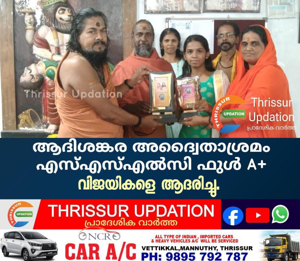 ആദിശങ്കര അദ്വൈതാശ്രമം പത്താം ക്ലാസ് ഫുൾ A+ വിജയികളെ ആദരിച്ചു.ആശ്രമത്തിൽ നടന്ന സത്സംഗ വേദിയിൽ മഠാധിപതി ഗുരുബാബനന്ദ സരസ്വതി, മാതാജി ഗീതപ്രിയാനന്ദ സരസ്വതി, സ്വാമി ദിവാകരാനന്ദ,ആചാര്യ രതീഷ് ശർമ്മ എന്നിവർ ആശംസകൾ അർപ്പിച്ചു.