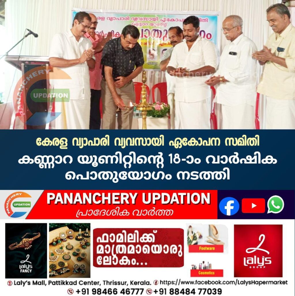 കേരള വ്യാപാരി വ്യവസായി ഏകോപന സമിതി കണ്ണാറ യൂണിറ്റിൻ്റെ 18-ാം വാർഷിക പൊതുയോഗം നടത്തി. യൂണിറ്റ് പ്രസിഡന്റ് ലിജോ ജോർജ്ജ് അധ്യക്ഷനായിരുന്നു.തൃശൂർ ജില്ലാ പ്രസിഡൻ്റും സംസ്ഥാന വൈസ് പ്രസിഡൻ്റുമായ കെ.വി. അബ്ദുൾ ഹമീദ് വാർഷികം ഉദ്ഘാടനം നിർവ്വഹിച്ചു. യോഗത്തിൽ ജില്ലാസെക്രട്ടറിയും ഒല്ലൂർ നിയോജകമണ്ഡലം ചെയർമാനുമായ ബിജു എടക്കളത്തൂർ മുഖ്യപ്രഭാഷണം നടത്തി.ഒല്ലൂർ മേഖല കൺവീനർ ശേഖരൻ ആശംസകൾ അറിയിച്ചു.
