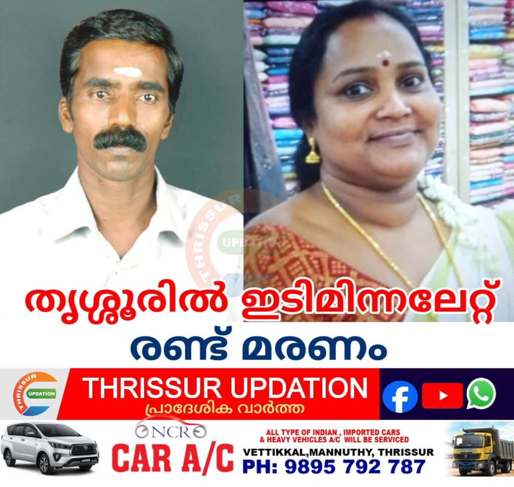 മിന്നലേറ്റ് തൃശ്ശൂരിൽ രണ്ട് മരണം. തലക്കോട്ടുകര തോപ്പിൽ വീട്ടിൽ ഗണേശൻ (50), വാഴൂർ ക്ഷേത്രത്തിന് സമീപം വേളേക്കാട്ട് സുധീറിൻ്റെ ഭാര്യ നിമിഷ (42) എന്നിവരാണ് മരിച്ചത്.വേലൂർ കുറുമാലിലെ വിദ്യ എൻജിനിയറിങ് കോളേജിനു സമീപത്തെ തറവാട്ടു വീട്ടിലേക്ക് വന്നപ്പോഴാണ് ഗണേശന് മിന്നലേറ്റത്. ശനിയാഴ്ച രാവിലെ 11.30-നായിരുന്നു സംഭവം. മിന്നലേറ്റ ഗണേശനെ നാട്ടുകാർ മെഡിക്കൽ കോളേജ് ആശുപത്രിയിലെത്തിച്ചെങ്കിലും രക്ഷിക്കാനായില്ല.തൃപ്രയാറിൽ വലപ്പാട് കോതകുളം ബീച്ചിലെ വീടിന് സമീപത്തുവച്ചാണ് മിന്നലേറ്റ് യുവതി മരിച്ചത്. ഇന്ന് രാവിലെ 10.30-ഓടെയാണ് സംഭവം. വീടിന് പുറത്തുള്ള കുളിമുറിയിൽ കുളിക്കാൻ പോയതാണ് നിമിഷ. ഈ സമയം ശക്തമായ ഇടിയും മിന്നലുമുണ്ടായിരുന്നു. നിമിഷ കുളി കഴിഞ്ഞ് വരാത്തതിനാൽ വീട്ടിലുള്ളവർ വന്ന് നോക്കിയപ്പോൾ കുളിമുറിയിൽ വീണു കിടക്കുന്നതാണ് കണ്ടത്. ആശുപത്രിയിലേക്ക് കൊണ്ടു പോയെങ്കിലും മരിച്ചിരുന്നു. കുളിമുറിയിലെ വയറിങ് ഉരുകിയ നിലയിലായിരുന്നു. ബൾബ് പൊട്ടിച്ചിതറിയിരുന്നു. ഒരു ഭാഗത്തെ കോൺക്രീറ്റ് അടർന്നു പോയിട്ടുണ്ട്.
