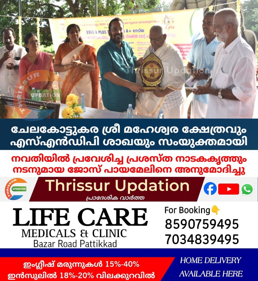 പ്രശസ്ത നാടകകൃത്തും നടനുമായ ജോസ് പായമേൽ നവതിയിൽ പ്രവേശിച്ചതിന്റെ ഭാഗമായി ശ്രീ മഹേശ്വര ക്ഷേത്രം ചേല കോട്ടുകരയും എസ് എൻ ഡി പി യോഗം ചേല കൊട്ടുകര ശാഖയും സംയുക്തമായി സംഘടിപ്പിച്ച അനുമോദന ചടങ്ങ് കേരള സംസ്ഥാന റവന്യൂ വകുപ്പ് മന്ത്രി കെ രാജൻ ഉദ്ഘാടനം നിർവഹിച്ചു. തുടർച്ചയായി 50 വർഷം തൃശ്ശൂർ പൂരം എക്സിബിഷനിൽ നാടകം നടത്തി,15000 സ്റ്റേജുകളിൽ നാടകം ഇന്ത്യയുടെ പല ഭാഗത്തുമായി അരങ്ങേറ്റം നടത്തിയതും, ഒട്ടനവധി നാടകങ്ങൾ എഴുതിയും, അഭിനയത്തിൽ മികവ് പുലർത്തിയും ജനശ്രദ്ധ നേടിയെടുത്ത വ്യക്തിത്വത്തിന്റെ ഉടമയാണ് ജോസ് പായമേൽ . 70 വർഷത്തെ കലാജീവിതം ആരോഗ്യ കാരണങ്ങളാൽ 2013 ശേഷം കലാജീവിതത്തിൽ നിന്ന് വിട വാങ്ങിയ അദ്ദേഹത്തിന് ദീർഘായുസ്സും ആരോഗ്യവും നൽകട്ടെ എന്ന് പ്രത്യേക പ്രാർത്ഥനയോടെ ഷാള് അണിയിച്ച് മെമെന്റോ നൽകി അനുമോദിച്ചു.തുടർന്ന് 2023 -2024 അധ്യായന വർഷത്തിൽ SSLC & + 2 വർഷ പരീക്ഷയിൽ ഫുൾ എ പ്ലസ് നേടിയ വിദ്യാർത്ഥികൾക്ക് പ്രത്യേക മൊമെന്റോ നൽകി അനുമോദനം നടത്തി. മുഴുവൻ വിദ്യാർത്ഥികളുടെ കൈവശം പുസ്തകം എത്തിക്കുന്നതിന്റെ ഭാഗമായി സൗജന്യ നിരക്കിൽ നോട്ടുപുസ്തകം നൽകുന്ന ചടങ്ങിന് പ്രത്യേക അനുമോദനം നൽകി. ശ്രീ മഹേശ്വര ക്ഷേത്രം പ്രസിഡൻ്റ് കെ യു വേണുഗോപാലന്റെ അധ്യക്ഷതയിൽ നടന്ന യോഗത്തിൽ വസന്തകുമാരി വേണുഗോപാൽ ഗുരുധർമ്മ പ്രചരണ സഭ മാതൃസഭ ജില്ലാ വൈസ് പ്രസിഡന്റ് പ്രഭാഷണം നടത്തുകയും ചെയ്തു,തുടർന്ന് ആശംസകൾ അർപ്പിച്ചു കൊണ്ട് തൃശ്ശൂർ കോർപ്പറേഷൻ കൗൺസിൽ അംഗങ്ങളായ ലീല വർഗീസ്, മേഴ്സി അജി, സുനിൽ രാജ്, കുളമുറ്റം ക്ഷേത്രം സെക്രട്ടറി സജേഷ്,വളർക്കാവ് ക്ഷേത്രം സെക്രട്ടറി പ്രസന്നൻ,കരിക്കാട്ടുകര ക്ഷേത്രം സെക്രട്ടറി അജിതൻ,എസ്എൻഡിപി യോഗം ചേലക്കൊട്ടുകര ശാഖാ പ്രസിഡന്റ് സുരേഷ്,സെക്രട്ടറി പ്രമോദ്,മഹേശ്വര ക്ഷേത്രം രക്ഷാധികാരി വിജയൻ പുളിക്കൽ,സോമൻ അമ്പലപ്പറമ്പിൽ എന്നിവർ സംസാരിച്ചു,യോഗത്തിൽ ക്ഷേത്രം സെക്രട്ടറി ഓ ക്കേ സത്യൻ നന്ദിയും ട്രഷറർ രജീഷ ദർശൻ നന്ദിയും പ്രകാശിപ്പിച്ചു