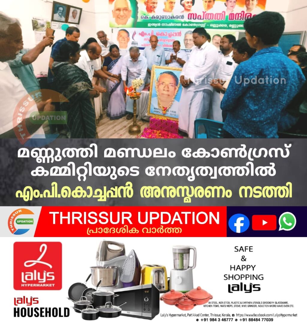 മണ്ണുത്തി മണ്ഡലം കോൺഗ്രസ്സ് കമ്മിറ്റിയുടെ ആഭിമുഖ്യത്തിൽ ദീർഘകാലം ഒല്ലൂക്കര മണ്ഡലം പ്രസിഡൻ്റും ,ഒല്ലൂക്കര സഹകരണ ബാങ്ക് ഡയറക്ടറും ,പഞ്ചായത്ത് മെമ്പറുമായിരുന്ന എം.പി. കൊച്ചപ്പൻ അനുസ്മരണം നടത്തി. മണ്ഡലം പ്രസിഡൻറ് എം.യു. മുത്തുവിൻ്റെ അദ്ധ്യക്ഷതയിൽ മുൻ നിയമസഭാ സ്പീക്കർ തേറമ്പിൽ രാമകൃഷ്ണൻ ഉദ്ഘാടനം ചെയ്തു. നൽപ്പത്തിരണ്ട് വർഷം മണ്ണുത്തിയുടെ പോസ്റ്റ്മാൻ ആയിരുന്ന പി.വി.വിജയൻ ,എഴുപതി അഞ്ചാം വയസ്സിൽ കാലിക്കറ്റ് സർവ്വകലാശാലയിൽ നിന്നും മാസ്റ്റർ ബിരുദം കരസ്തമാക്കിയ സി.വി. പൊറിഞ്ചു എന്നിവരെ ചടങ്ങിൽ ആദരിച്ചു മുഴുവൻ വിഷയങ്ങളിൽ എ പ്ലസ്സ് നേടിയ വിദ്യർത്ഥികളെ കൊച്ചപ്പേട്ടൻ സ്മാരക വിദ്യഭ്യാസ പുരസ്കാരങ്ങൾ നൽകി ചടങ്ങിൽ ആദരിച്ചു കെ.പി.സി.സി. നിർവ്വാഹനസമതി അംഗം ലീലാമ്മ തോമസ്സ് ,ഡി.സി.സി. നിർവ്വാഹന സമതി അംഗം കെ.സി.അഭിലാഷ് ,ജോണി അരിമ്പൂര്, ഗിരിഷ് കുമാർ ,ജോൺസൻ ആവോക്കാരൻ ,ടി.വി.തോമസ്സ്, ഭാസ്കരൻ കെ.മാധവൻ ,ബേബി പാലോലിയ്ക്കൽ ,ആർ.എ. ബാവ ,സി.ജെ.രാജേഷ്,മേ ജോമോസസ്സ് ,ജാൻസി ടീച്ചർ ,സഫിയ നിഷാദ് ,ഫിലോമിന ജോസ് ,ജോസ് പുലിക്കോട്ടിൽ ,മജീദ് കെ.എച്ച് .തുടങ്ങിയവർ പങ്കെടുത്തു സംസാരിച്ചു