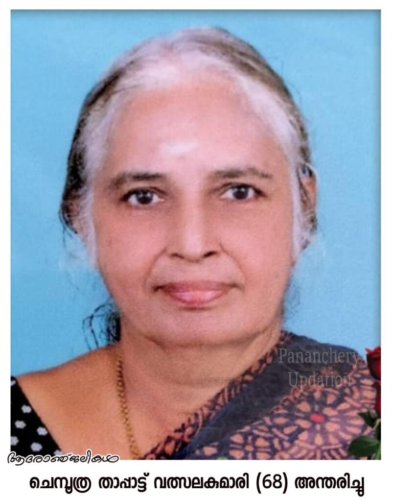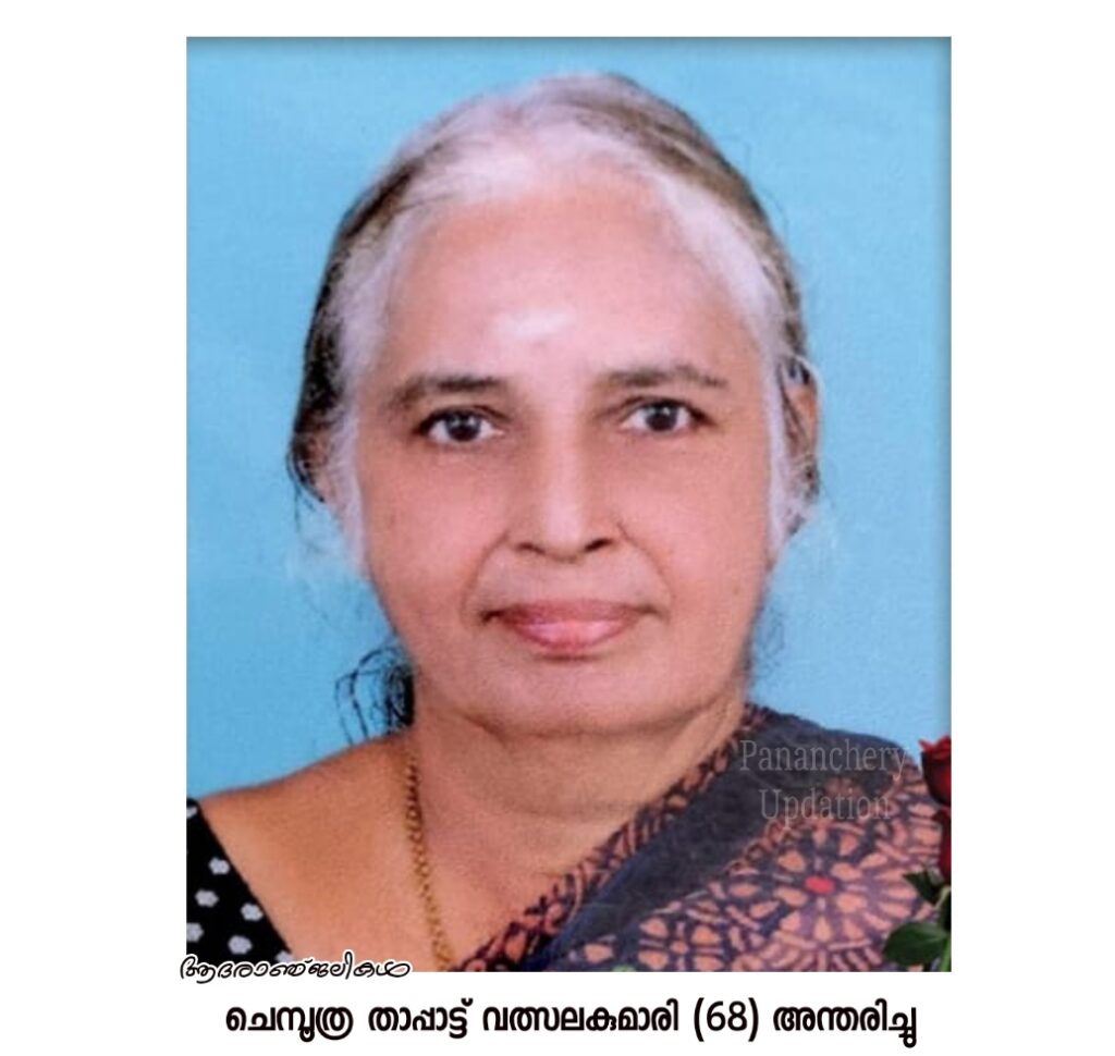 പരേതനായ ആന്തൂർ അപ്പു നായർ മകൾ താപ്പാട്ട് വത്സലകുമാരി (68) അന്തരിച്ചു.സംസ്കാരം ഇന്ന് (03.06.2024- തിങ്കൾ )വൈകീട്ട് 3 ന് പാമ്പാടി ഐവർമഠം ശ്മശാനത്തിൽ