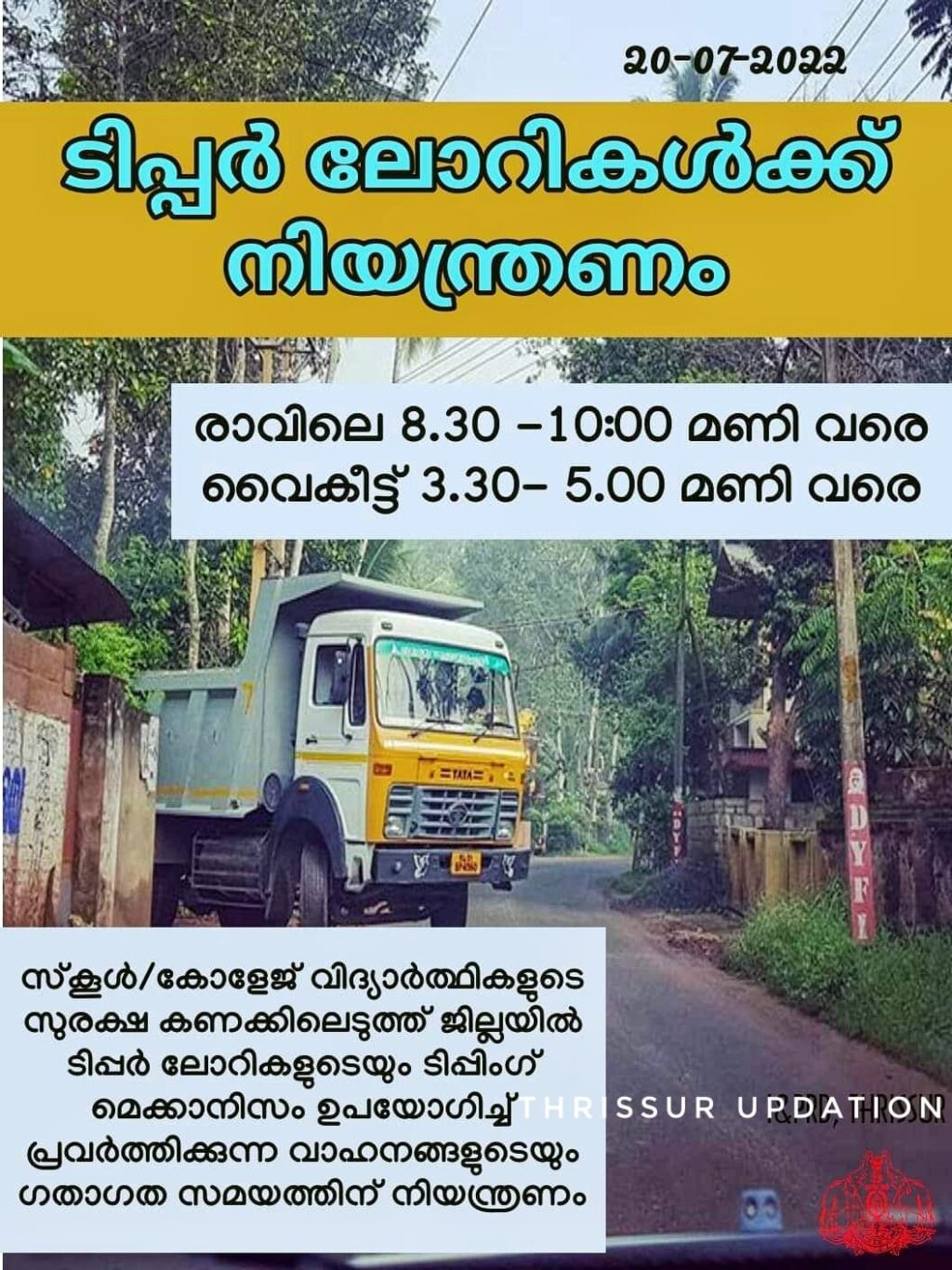 ജില്ലയില് ടിപ്പര് ലോറികളുടെയും ടിപ്പിംഗ് മെക്കാനിസം ഉപയോഗിച്ച് പ്രവര്ത്തിക്കുന്ന വാഹനങ്ങളുടെയും ഗതാഗത സമയത്തിന് നിയന്ത്രണം ഏര്പ്പെടുത്തിക്കൊണ്ട് ജില്ലാ കലക്ടര് ഉത്തരവിറക്കി. രാവിലെ 8.30 മുതല് 10:00 മണി വരെയും വൈകീട്ട് 3.30 മുതല് 5.00 മണി വരെയും ഇവയ്ക്ക് നിരോധനം ഏര്പ്പെടുത്തിയാണ് ഉത്തരവ്. ജില്ലയില് തദ്ദേശ സ്വയംഭരണ സ്ഥാപനങ്ങളിലെ മാലിന്യം നീക്കുന്നതിനായി ഉപയോഗിക്കുന്ന ടിപ്പര്