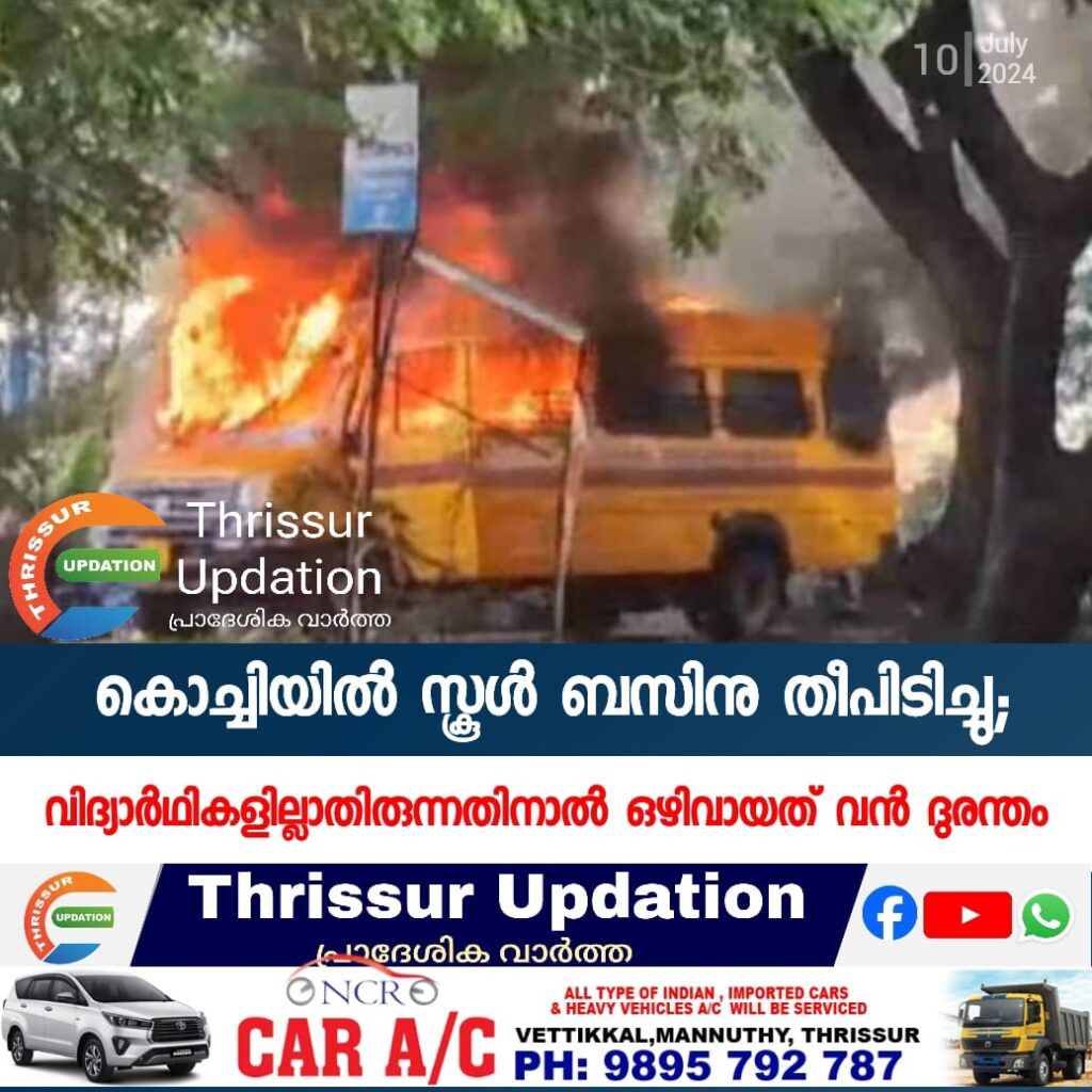 സ്കൂളിലേക്കു കുട്ടികളെ എടുക്കാൻ പോകുമ്പോഴായിരുന്നു സംഭവം. ബസിൽനിന്നു പുക ഉയരുന്നതു കണ്ടു ഡ്രൈവർ പുറത്തിറങ്ങി. ഈ സമയം ഇതിലൂടെ കടന്നുപോയ കുടിവെള്ള ടാങ്കറിൽനിന്നു ബസിലേക്കു വെള്ളമൊഴിച്ചു. അഗ്നിശമന സേനയെത്തിയാണു തീ നിയന്ത്രണവിധേയമാക്കിയത്. ബസ് മുഴുവനായും കത്തിനശിച്ചു.