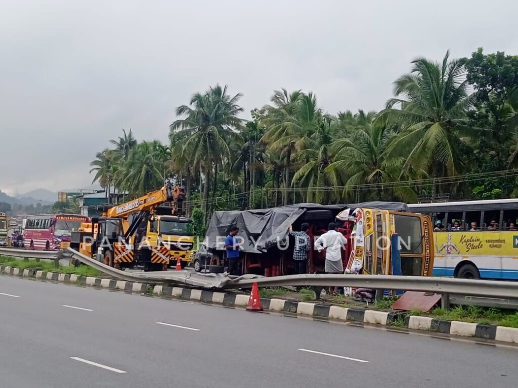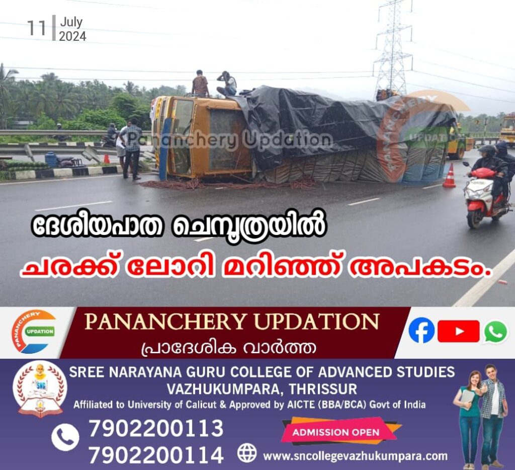 ദേശീയപാത ചെമ്പൂത്രയിൽ തൃശൂർ ഭാഗത്തേക്കുള്ള പാതയിൽ അലീസ് ആശുപത്രിക്ക് സമീപം ചരക്ക് ലോറി മറിഞ്ഞ് അപകടം. ഇന്നലെ രാത്രിയാണ് അപകടം ഉണ്ടായത്. അപകടത്തിൽ ആർക്കും പരിക്കില്ല.ലോറി നിയന്ത്രണം വിട്ട് ദേശീയപാതയിലെ അയൺ ക്രാഷ് ബാരിയറിൽ ഇടിച്ച് റോഡിലേക്ക് മറിയുകയായിരുന്നു.