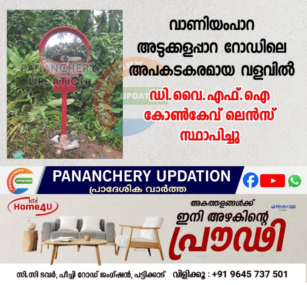 വാണിയംപാറ മഞ്ഞവാരി അടുക്കളപാറ റോഡിലെ അപകടകരമായ വളവിൽ ഡി.വൈ.എഫ്.ഐ കോൺകേവ് ലെൻസ് സ്ഥാപിച്ചു. ഡി.വൈ.എഫ്.ഐ പാണഞ്ചേരി മേഖല ട്രെഷറർ ലിജോ ജോർജ്, എക്സിക്യൂട്ടീവ് അംഗം ശിവപ്രസാദ്, മേഖല കമ്മിറ്റി അംഗം മുജീബ് അടുക്കളപാറ തുടങ്ങിയവർ പങ്കെടുത്തു