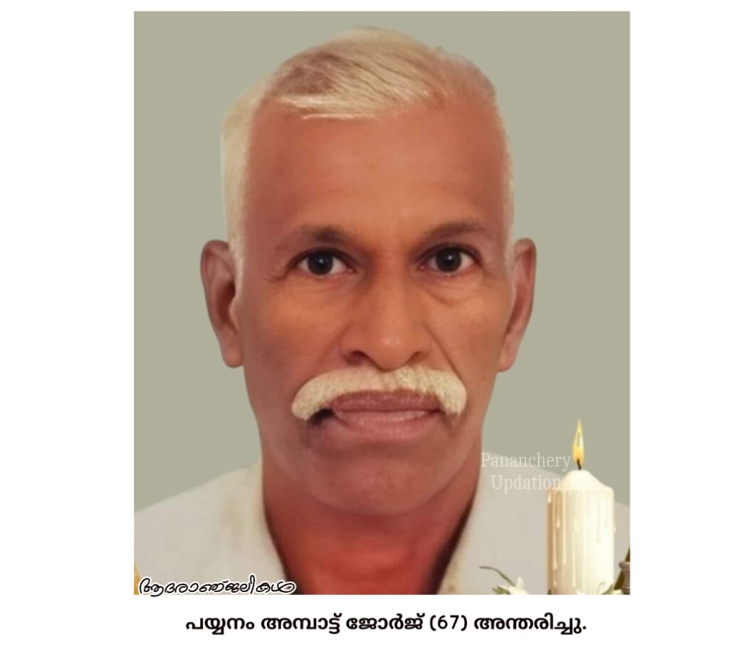 പയ്യനം അമ്പാട്ട് കുര്യാക്കോസ് മകൻ ജോർജ് (67) അന്തരിച്ചു. സംസ്കാരം നാളെ (12.07 .2024- വെള്ളിയാഴ്ച) രാവിലെ 10 മണിക്ക് കണ്ണാറ സെൻറ് മേരീസ് യാക്കോബായ സുറിയാനി പള്ളിയിൽ. ഭാര്യ: മേരി. മക്കൾ: ഷൽബി, പരേതനായ ബിനോയ്, മരുമകൻ: ഷോജൻ