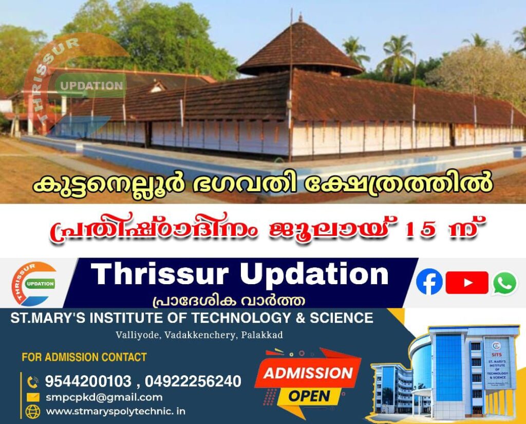 കുട്ടനെല്ലൂർ ഭഗവതി ക്ഷേത്രത്തിൽ പ്രതിഷ്ഠാദിനം ജൂലായ് 15ന് നടക്കും. നവകം, പഞ്ചഗവ്യം, കലശപൂജ, തൽകലശാഭിഷേകം എന്നി ചടങ്ങുകൾക്ക് തന്ത്രി അണിമംഗലത്ത് ശ്രീവല്ലഭൻ നമ്പൂതിരിയുടെ മുഖ്യകാർമികത്വം വഹിക്കും. രാവിലെ 11 മുതൽ പ്രസാദം ഊട്ട്, വൈകിട്ട് വിശേഷാൽ നിറമാല, രാജലക്ഷ്മി വിജയന്റെ കർണാടകസംഗീതം തുടങ്ങിയവയും ആഘോഷങ്ങളുടെ ഭാഗമായി നടക്കും.