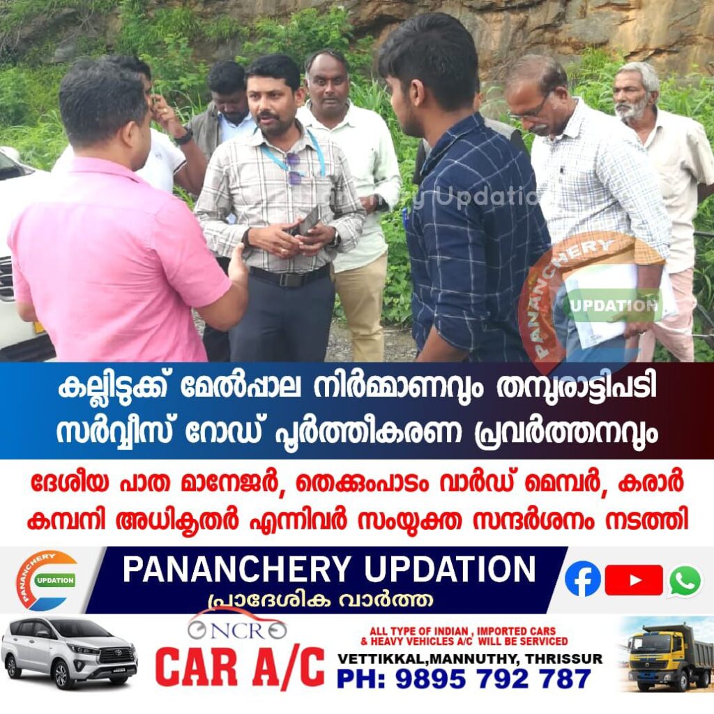 കല്ലിടുക്ക് മേൽപ്പാല നിർമ്മാണവും തമ്പുരാട്ടിപടി സർവ്വീസ് റോഡ് പൂർത്തീകരണ പ്രവർത്തനവും ദേശീയ പാത മാനേജർ, തെക്കുംപാടം വാർഡ് മെമ്പർ, കരാർ കമ്പനി അധികൃതർ എന്നിവർ സംയുക്ത സന്ദർശനം നടത്തി. ദേശീയ പാത 544 ൽ കല്ലിടുക്ക്, മുടിക്കോട്, വാണിയംപാറ എന്നിവടങ്ങളിലെ മേൽപ്പാല നിർമ്മാണം 2025 സെപ്തംബറോടെയും, തമ്പുരാട്ടി പടി സർവ്വീസ് റോഡ് നിർമ്മാണം 2025 ഫെബ്രുവരിയോടെയും പൂർത്തീകരിക്കാൻ ഉദ്ധേശിച്ച് കൊണ്ടാണ് നിർമ്മാണ പ്രവർത്തനങ്ങൾ മുന്നോട്ട് പോകുന്നതെന്ന് ദേശീയപാത മാനേജർ ബിജുകുമാർ പാണഞ്ചേരി ഗ്രാമ പഞ്ചായത്തംഗം അനീഷ് മേക്കരയെ അറിയിച്ചു. കരാർ കമ്പനി അധികൃതരും നാട്ടുകാരും സംയുക്ത സന്ദർശനത്തിൽ പങ്കെടുത്തു.