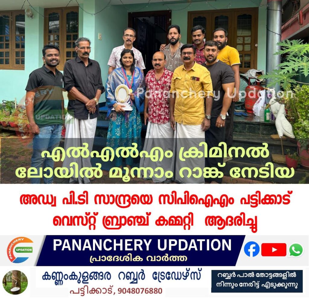 അഡ്വ പി.ടി സാന്ദ്രയെ സിപിഐ പട്ടിക്കാട് വെസ്റ്റ് ബ്രാഞ്ച് കമ്മറ്റി ആദരിച്ചു.
