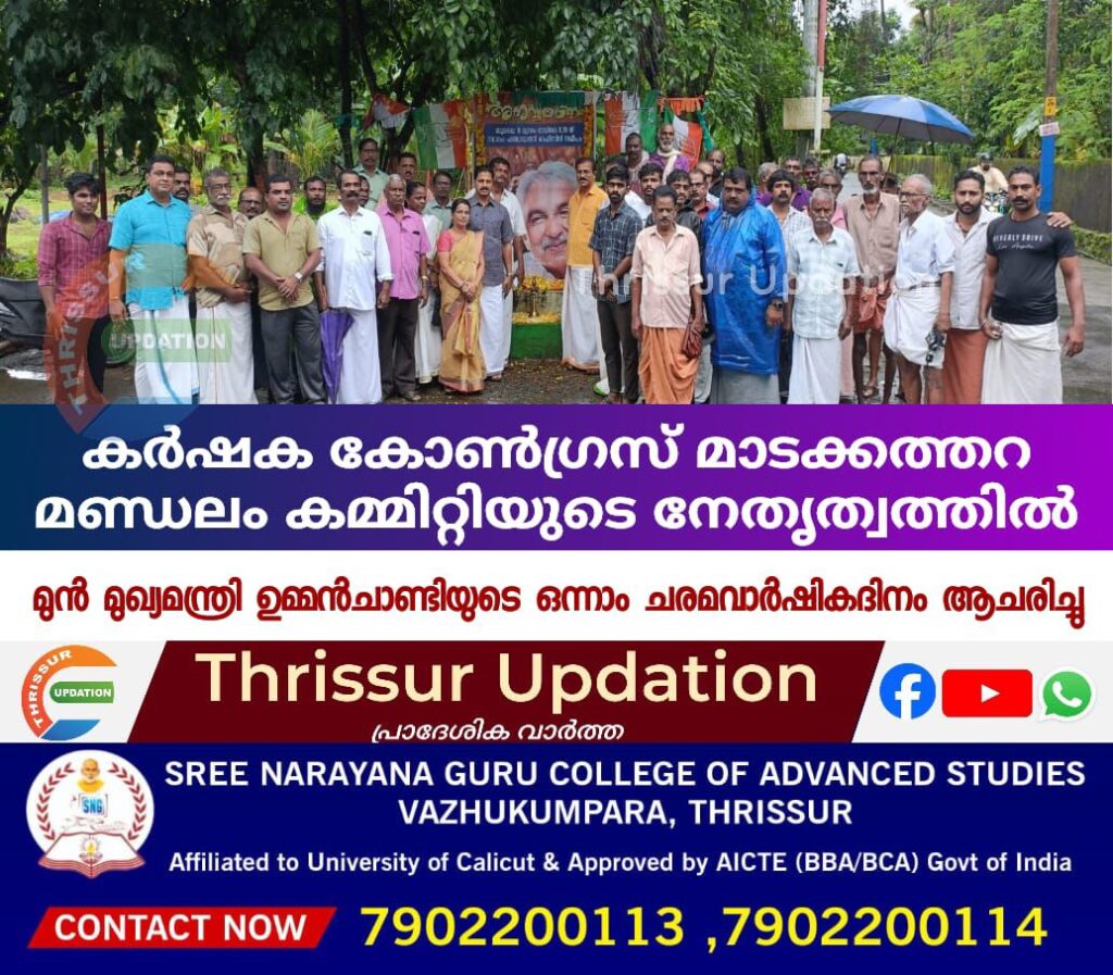കർഷക കോൺഗ്രസ് മാടക്കത്തറ മണ്ഡലം കമ്മിറ്റിയുടെ നേതൃത്വത്തിൽ മുൻ മുഖ്യമന്ത്രി ഉമ്മൻചാണ്ടിയുടെ ഒന്നാം ചരമവാർഷികദിനം ആചരിച്ചു.മാടക്കത്തറ പഞ്ചായത്ത് ഓഫീസിനു മുമ്പിൽ നടന്ന ചടങ്ങിൽ കർഷക കോൺഗ്രസ് മണ്ഡലം പ്രസിഡൻ്റ് ഷോണി പുളിക്കൻ അദ്ധ്യക്ഷനായി.പ്രിയദർശിനി പബ്ലിക്കേഷൻസ് സംസ്ഥാന കോർഡിനേറ്റർ K.S. ചന്ദ്രാനന്ദൻ, OICC /INCAS മുൻ ഗ്ലോബൽ വൈസ് പ്രസിഡന്റ് Dr. മനോജ് പുഷ്കർ , മുൻ പഞ്ചായത്ത് മെമ്പർ ത്രേസ്സ്യദേവസ്സി, പെൻഷനേഷ്സ് അസോസിയേഷൻ നേതാക്കളായ ജോസ്, T.C. അശോകൻ, വർഗീസ് മേനാച്ചേരി, കോൺഗ്രസ് ബ്ലോക്ക് സെക്രട്ടറി K.S. സുധീർ, St. തോമസ് കോളേജ് യൂണിയൻ ജനറൽ സെക്രട്ടറി വിൽഫ്രഡ്, യൂത്ത് കോൺഗ്രസ് നേതാക്കളായ അനൂപ് ദാസ്, അനിൽ, സീരിയൽ തിരക്കഥാകൃത്ത് ബാബു താണിക്കുടം, കോൺഗ്രസ് മണ്ഡലം സെക്രട്ടറി N.U. ശ്രീനിവാസൻ തുടങ്ങി നൂറോളം പേർ ഈ കോരിച്ചൊരിയുന്ന മഴക്കിടയിൽ സംഘടിപ്പിച്ച, ജനകീയ പരിപാടിയിൽ പങ്കെടുത്തു.