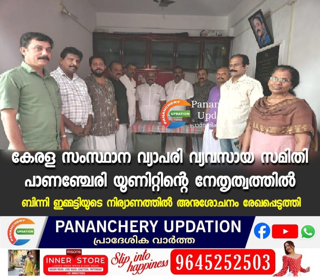 കേരള സംസ്ഥാന വ്യാപരി വ്യവസായ സമിതി പാണഞ്ചേരി യൂണിറ്റ് സെക്രട്ടറി തോമസ് സാമുവേലിൻ്റെ നേതൃത്വത്തിൽ വ്യാപരി വ്യവസായി സമിതി മുൻ പ്രസിഡൻ്റ് ബിന്നി ഇമ്മട്ടിയുടെ നിര്യാണത്തിൽ അനുശോച്ചനം രേഖപ്പെടുത്തി. പ്രസിഡൻ്റ് ബാബു കൊള്ളന്നൂർ അധ്യക്ഷത വഹിച്ചു. ട്രഷറർ കൃഷ്ണൻകുട്ടി, രാജേന്ദ്രൻ മുല്ലപ്പള്ളി എന്നിവർ സംസാരിച്ചു. എക്സിക്യൂട്ടീവ് മെമ്പർമാരും, വ്യാപരി സുഹൃത്തുക്കളും ചടങ്ങിൽ പങ്കെടുത്തു.
