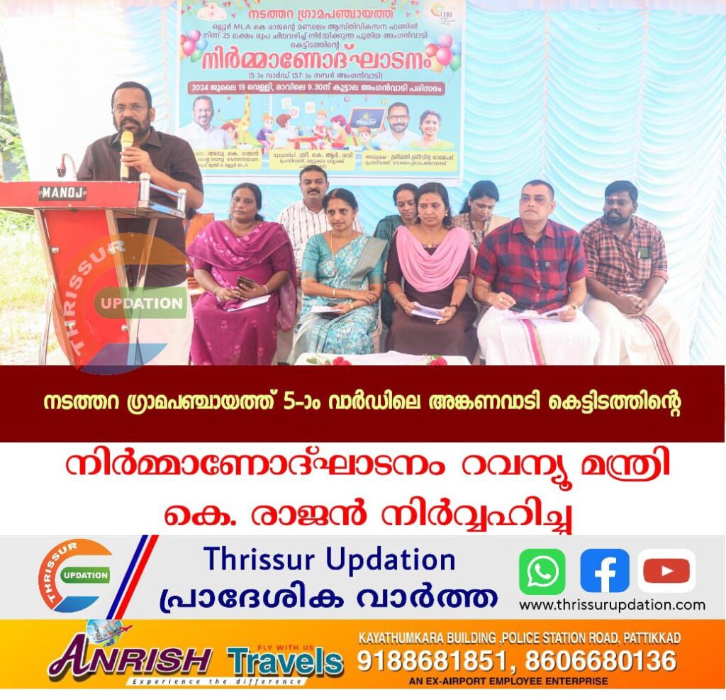 നടത്തറ ഗ്രാമപഞ്ചായത്ത് 5-ാം വാര്ഡിലെ 157-ാം നമ്പര് അങ്കണവാടി പുതിയ കെട്ടിടത്തിന്റെ നിര്മ്മാണോദ്ഘാടനം റവന്യു – ഭവന നിര്മ്മാണ വകുപ്പു മന്ത്രി കെ. രാജന് നിര്വ്വഹിച്ചു. ഒല്ലൂര് എംഎല്എയുടെ മണ്ഡലം ആസ്തിവികസന ഫണ്ടില്നിന്ന് 25 ലക്ഷം രൂപ ചിലവഴിച്ചാണ് അങ്കണവാടി കെട്ടിടം നിര്മ്മിക്കുന്നത്. 2024 ഡിസംബര് മാസത്തില്ത്തന്നെ ഉദ്ഘാടനം നടത്താവുന്ന രീതിയില് നിര്മ്മാണ പ്രവൃത്തികല് പൂര്ത്തിയാക്കണമെന്ന് മന്ത്രി ഉദ്ഘാടന പ്രസംഗത്തില് പറഞ്ഞു. പഞ്ചായത്തില് പ്രവര്ത്തിച്ചുവരുന്ന 30 അങ്കണവാടികളില് സ്ഥല ലഭ്യതയുടെ അഭാവംമൂലം വാടകക്കെട്ടിടത്തില് വര്ഷങ്ങളായി പ്രവര്ത്തിച്ചുവരുന്ന 5-ാം വാര്ഡിലെ 157-ാം നമ്പര് അങ്കണവാടിക്കുവേണ്ടി സൗജന്യമായി ലഭിച്ച കൂട്ടാലയിലെ നാല് സെന്റ് സ്ഥലത്താണ് അങ്കണവാടി കെട്ടിടം നിര്മ്മിക്കുന്നത്.