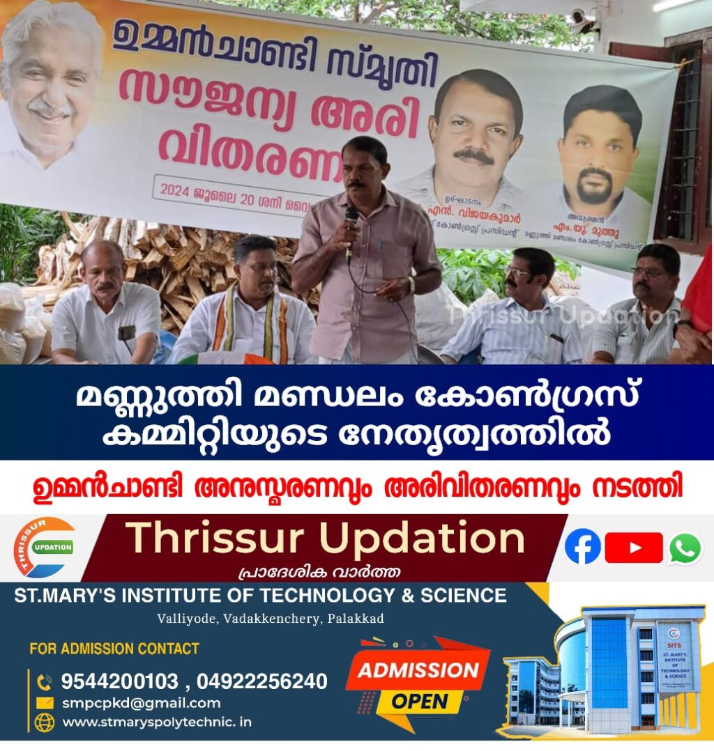 മണ്ണുത്തി മണ്ഡലം കോൺഗ്രസ് കമ്മിറ്റിയുടെ നേതൃത്വത്തിൽ ഉമ്മൻചാണ്ടി അനുസ്മരണവും അരിവിതരണവും നടത്തി. പട്ടാളക്കുന്ന് നാല് സെന്റ് 3 സെന്റ് കോളനിയിലെ 150 ഓളം കുടുംബങ്ങൾക്കാണ് സൗജന്യമായി അരി വിതരണം നടത്തിയത് മണ്ഡലം പ്രസിഡന്റ് എം. യു. മുത്തുവിന്റെ അധ്യക്ഷതയിൽ നടന്ന അനുസ്മരണ സമ്മേളനം പാണഞ്ചേരി ബ്ലോക്ക് കോൺഗ്രസ് പ്രസിഡന്റ് കെ. എൻ. വിജയകുമാർ ഉദ്ഘാടനം നിർവഹിച്ചു കോൺഗ്രസ് നേതാക്കളായ ജോണി അരിമ്പൂർ. ടി ജെ ജോസ്, കരീം ഖാൻ, ഫ്രാൻസീസ് മാളിയേക്കൽ,മേജോ മോസസ്, ജോയ് കെ.ജി, ലിസി ജോൺസൺ, റോയ് എം ടി, ഹരി തെകൂട്ട്,സുബ്രൻ പ്ലാവിളപ്പിൽ, ജോസ് പാറക്കൽ തുടങ്ങിയവർ പങ്കെടുത്ത് സംസാരിച്ചു