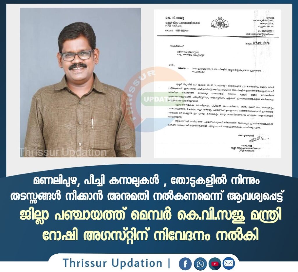 പ്രളയത്തിനുശേഷം മണലിപ്പുഴയും, പീച്ചിയിൽ നിന്നാരംഭിക്കുന്ന, ഇടത്, വലത് കര കനാലുകളും, അനുബന്ധതോടും, ചെളിയും, മണ്ണും, മരങ്ങളും, പ്രളയാവിശിഷ്ടങ്ങളും വന്ന് നിറഞ്ഞിരിക്കുകയാണ്. ഇനിയൊരു ശക്തമായ മഴ പെയ്താൽ ഈ പുഴയും, കനാലുകളും, തോടും കരകവിഞ്ഞൊഴുകി വെള്ളപൊക്കമുണ്ടാകുവാൻ സാധ്യതയുണ്ട്. അതിനാൽ മേൽപ്പറഞ്ഞ പ്രളയാവശിഷ്ടങ്ങൾ നീക്കുന്നതിന് ബന്ധപ്പെട്ട ഗ്രാമപഞ്ചായത്തുകൾക്ക് അനുമതി നൽകുന്നതിനും ഇക്കാര്യത്തിൽ പ്രത്യേക ഫണ്ട് അനുവദിക്കണമെന്നും ആവശ്യപ്പെട്ട് ജലവിഭവ വകുപ്പ് മന്ത്രി മന്ത്രി റോഷി അഗസ്റ്റിന് നിവേദനം നൽകി.റവന്യൂ വകുപ്പ് മന്ത്രി Adv. കെ. രാജൻ, തദ്ദേശ വകുപ്പ് മന്ത്രി എം.ബി. രാജേഷ് എന്നിവർക്ക് നിവേദനം നൽകി.