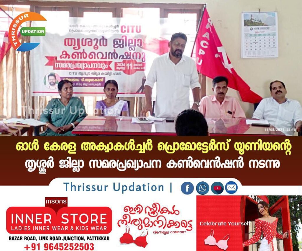 ഓൾ കേരള അക്വാകൾച്ചർ പ്രൊമോട്ടേർസ് യൂണിയൻ ജില്ലാ സമരപ്രഖ്യാപന കൺവെൻഷൻ CITU ജില്ല സെക്രട്ടറി ടി. സുധാകരൻ ഉദ്ഘാടനം ചെയ്തു . AKACPU ജില്ലാ പ്രസിഡൻറ് രജിത ഉല്ലാസ് അദ്ധ്യക്ഷത വഹിച്ചു. ഫിഷറീസ് വകുപ്പിലെ താൽക്കാലിക ജീവനക്കാരായ പ്രൊമോട്ടർമാർക്ക് 2023 എപ്രിൽ മുതൽ മാർച്ച് വരെ വെട്ടികുറച്ച തൊഴിൽ ദിനങ്ങളുടെ വേതനം നൽകാതിരികെ ശേഷമുള്ള നാല് മാസത്തെ ഒരു രൂപ പോലും വേതനം ലഭിച്ചിട്ടില്ല. പഞ്ചായത്ത് അടിസ്ഥാനത്തിൽ ഫീൽഡ് തല തൊഴിലെടുക്കുന്ന ജീവനക്കാർ കേന്ദ്ര- കേരള സർക്കാരിൻ്റെ വിവിധ പദ്ധതികളാണ് ഫീൽഡ് തലത്തിൽ നടപ്പിലാക്കുന്നത് യാത്രാകൂലിക്ക് പോലും പണമില്ലാത്ത സാഹചര്യത്തിൽ പോലും അധിക ജോലിയായി മത്സ്യ തൊഴിലാളി മേഖലയിലെ സോഷ്യോ – ഇക്കണോമിക് സർവ്വേ ചെയ്യുവാനും പ്രൊമോട്ടർമാർ നിർബന്ധിതരായി.പ്രൊമോട്ടർമാരുടെ വെട്ടി കുറച്ച വേതനം, ശമ്പള കുടിശ്ശിക അനുവദിക്കുക, ജനകീയ മത്സ്യകൃഷി പദ്ധതിക്ക് മതിയായ ഫണ്ട് അനുവദിക്കുക , ജോലിസ്ഥിരത ഉറപ്പുവരുത്തുക , കർഷകർക്ക് നൽകുവാനുള്ള സബ്സിഡി അനുവദിക്കുക , ദിവസവേതനം മാറ്റി പ്രൊമോട്ടർമാരെ കരാർ അടിസ്ഥാനപ്പെടുത്തി മാസശമ്പളം അനുവദിക്കുക, മിനിമം വേതനം 22000 രൂപയാക്കുക . തുടങ്ങിയ ആവശ്യങ്ങളുന്നയിച്ച് ആഗസ്റ്റ് 19 ന് നടത്തുന്ന സെക്രട്ടറിയേറ്റ് മാർച്ച് വിജയിപ്പിക്കാനും തീരുമാനിച്ചു. AKACPU സംസ്ഥാനകമ്മിറ്റി ട്രഷറർ പി . എം . ശശികുമാർ യോഗത്തിൽ പങ്കെടുത്തു. ജില്ല സെക്രട്ടറി വിദ്യ ഷാജി റിപ്പോർട്ട് അവതരിപ്പിച്ചു. ശാലിനി സ്വാഗതം പറഞ്ഞ യോഗത്തിന് അക്ഷയ നന്ദിയും പറഞ്ഞു.