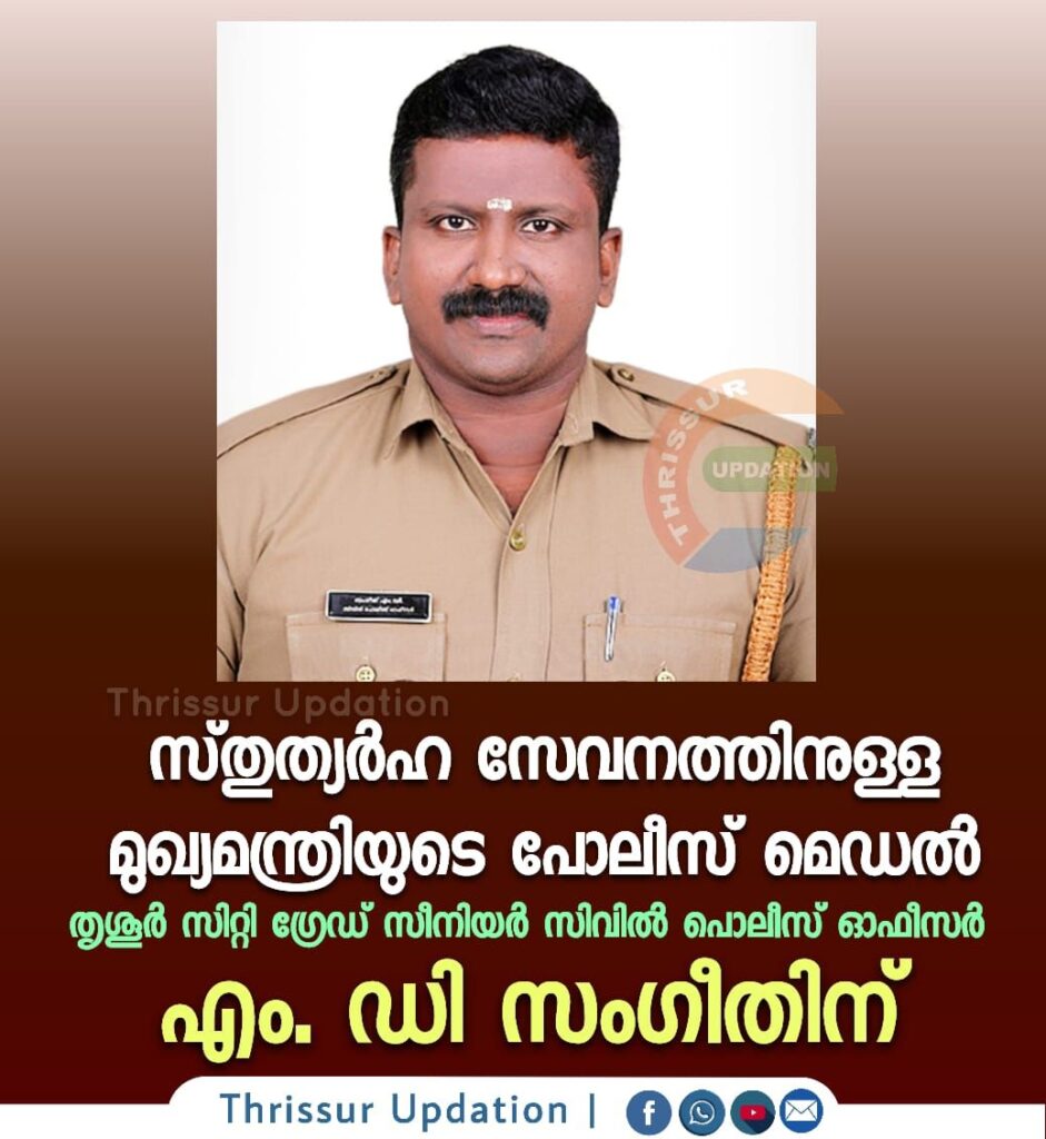 സ്തുത്യർഹ സേവനത്തിനു കേരള മുഖ്യ മന്ത്രിയുടെ പോലീസ് മെഡലിനു തൃശൂർ DCPHQ പ്രോസീക്യൂഷൻ വിംഗ് ലെ ഗ്രേഡ് സീനിയർ സിവിൽ പോലീസ് ഓഫീസർ എം. ഡി സംഗീത് അർഹനായി . കൂർക്കേഞ്ചേരി മഞ്ചേരി വീട്ടിൽ ദാസന്റെയും പരേതയായ സരസ്വതിയുടെയും മകനാണ് സംഗീത്. സഹോദരൻ സജിത്ത് .ഭാര്യ- മിഥുന സംഗീത്, തൃശൂർ സേക്രെഡ് ഹാർട്ട് സ്കൂളിലെ 2 ക്ലാസ്സ് വിദ്യാർത്ഥി മീനാക്ഷി സംഗീത്, ഗസൽ സംഗീത് എന്നിവർ മക്കളാണ്.