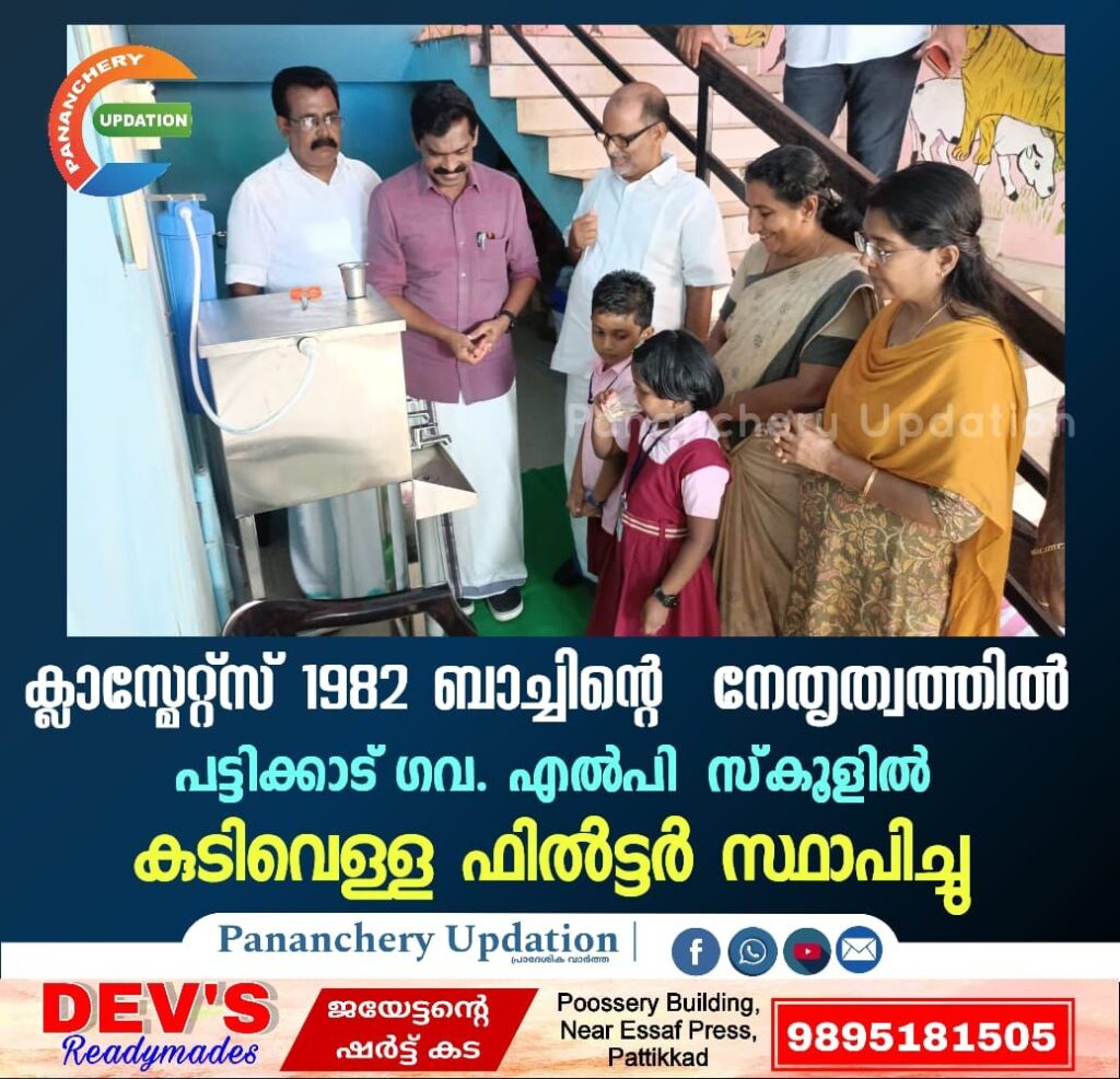 ക്ലാസ്മേറ്റ്സ് 1982 ബാച്ചിൻ്റെ നേതൃത്വത്തിൽ പട്ടിക്കാട് ഗവ. എൽപി സ്കൂളിൽ കുടിവെള്ള ഫിൽട്ടർ സ്ഥാപിച്ചു.ചടങ്ങിൽ പഞ്ചായത്ത് പ്രസിഡൻറ് പി പി രവീന്ദ്രൻ , വാർഡ് മെമ്പർ ആനി ജോയ് , അധ്യാപകർ ,വിദ്യാർഥികൾ എന്നിവർ പങ്കെടുത്തു.