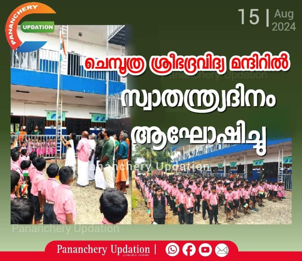 ചെമ്പൂത്ര ശ്രീഭദ്രവിദ്യ മന്ദിറിൽ ഭാരതത്തിന്റെ 78-ാം സ്വാതന്ത്ര്യദിനം ആഘോഷിച്ചു. സ്കൂൾ അങ്കണത്തിൽ ചേർന്ന ചടങ്ങിൽ സ്കൂൾ പ്രിൻസിപ്പൽ നീന .പി ദേശീയപതാക ഉയർത്തി ,സ്വാതന്ത്ര്യ ദിന പ്രഭാഷണം നടത്തി. സ്കൂൾ ചെയർമാൻ കെ.കെ രാജേഷ് , പി.ടി.എ പ്രസിഡന്റ് സുകേഷ് എന്നിവർ സ്വാതന്ത്ര്യദിന സന്ദേശം കൈമാറി കൊണ്ട് കുട്ടികൾക്ക് സ്വാതന്ത്യദിന ആശംസകൾ നേർന്നു.