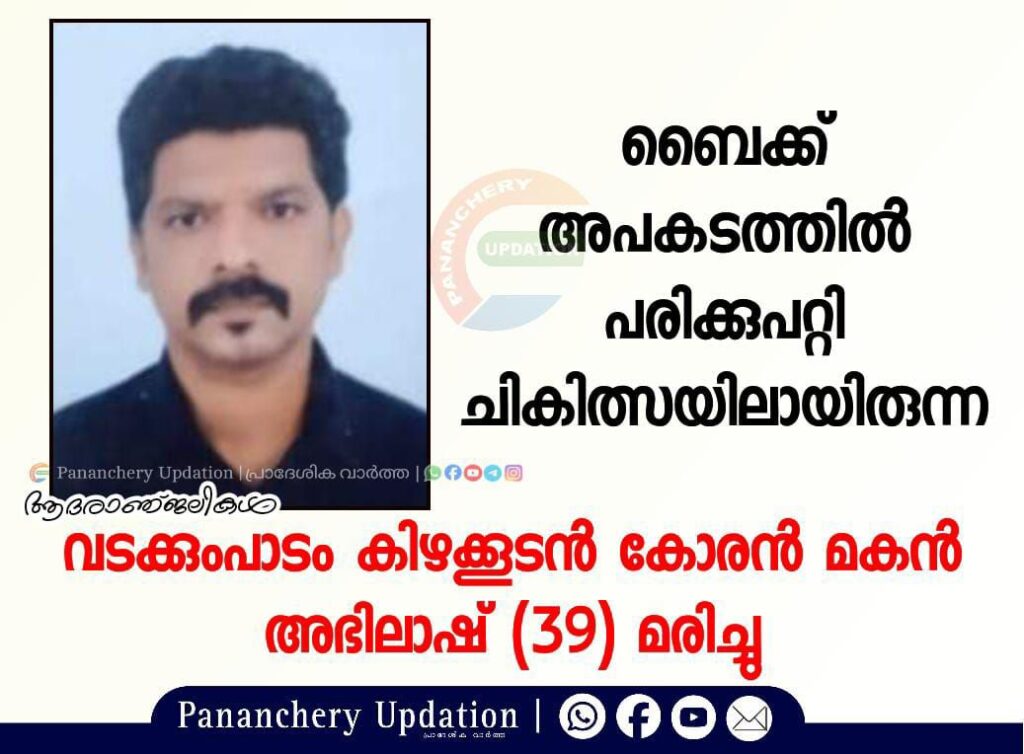 വടക്കുംപാടം കിഴക്കൂടൻ കോരൻ മകൻ അഭിലാഷ് (39) ആണ് മരിച്ചത്. ഒരാഴ്ച മുൻപ് നീലിപാറയിൽ ഉണ്ടായ ബൈക്ക് അപകടത്തിൽ മാരകമായി പരിക്ക് പറ്റി തൃശ്ശൂർ മെഡിക്കൽ കോളേജിൽ ചികിത്സയിലായിരുന്നു. അഭിലാഷിന്റെ കൂടെയുണ്ടായിരുന്ന സുഹൃത്തും പരിക്കുപറ്റി ചികിത്സയിലാണ്. പട്ടിക്കാട്ടിലെ ബൈക്ക് മെക്കാനിക്കൽ ആണ് അഭിലാഷ്. ഇന്ന് പോസ്റ്റുമോട്ടത്തിനുശേഷം മൃതദേഹം സംസ്കരിക്കും.