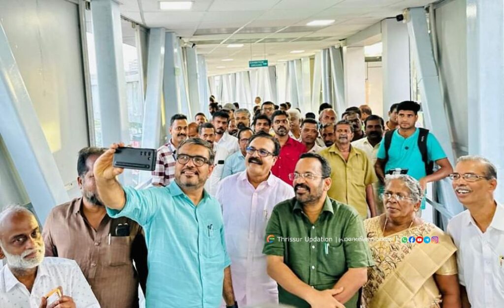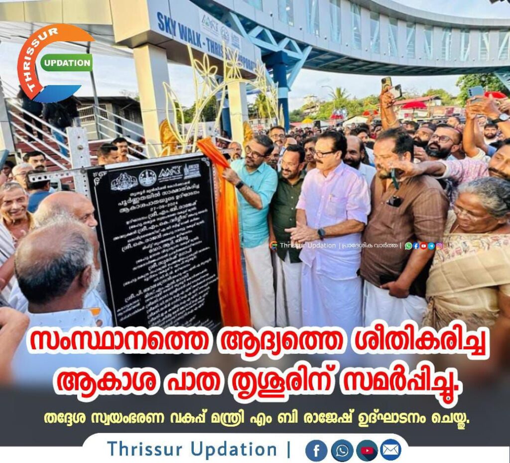 വൃത്താകൃതിയിലുള്ള കേരളത്തിലെ ആദ്യ ആകാശപ്പാത ഇനി തൃശൂരിനു സ്വന്തം. പൂർണമായി ശീതീകരിച്ചും സൗരോർജത്താൽ വൈദ്യുതീകരിച്ചും ആധുനിക സൗകര്യങ്ങളോടെ 11 കോടി രൂപ ചെലവിൽ കോർപറേഷൻ നിർമാണം പൂർത്തീകരിച്ച ശക്തൻ നഗർ ആകാശപ്പാത നാടിനു സമർപ്പിച്ചു. 3 മീറ്റർ ആണ് നടപ്പാതയുടെ വീതി. ഇറങ്ങാനും കയറാനും പടികൾക്കു പുറമെ, 4 വശങ്ങളിലായി ലിഫ്റ്റും സുരക്ഷയ്ക്കായി 20 സിസിടിവി ക്യാമറകളും ഉണ്ട്. 2 സെക്യൂരിറ്റി ഗാർഡുമാരും 4 ലിഫ്റ്റ് ഓപ്പറേറ്റർമാരും സേവനത്തിനുണ്ട്.രാവിലെ 8 മുതൽ രാത്രി 9 വരെയാണ് ആകാശപ്പാതയുടെ സമയം. ആകാശപ്പാതയുടെ സമർപ്പണം മന്ത്രി എം.ബി.രാജേഷും സൗരോർജ പാനലിന്റെയും സിസിടിവി ക്യാമറകളുടെയും ഉദ്ഘാടനം മന്ത്രി കെ.രാജനും നിർവഹിച്ചു.