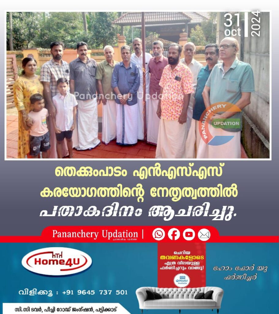 തെക്കുംപാടം എൻഎസ്എസ് കരയോഗത്തിൻ്റെ നേതൃത്വത്തിൽ പതാകദിനം ആചരിച്ചു. നായർ സർവീസ് സൊസൈറ്റി രൂപീ കൃതമായത് 1914 ഒക്ടോബർ 31 ന് ആണ് ആയതിൻ്റെ സ്മരണാർത്ഥം ഒക്ടോബർ 31 പതാക ദിനമായി ആചരിക്കുന്നു. കരയോഗം പ്രസിഡൻ്റ് N S പീതാംബരൻ പതാക ഉയർത്തി വനിതാ സമാജം മെമ്പർ രേഷ്മ രാഗേഷ് പ്രതിജ്ഞ ചൊല്ലി കൊടുത്തു സെക്രട്ടറി രാജേന്ദ്രൻ മുല്ലപ്പിള്ളി സ്വാഗതവും ട്രഷറർ സുനിൽകുമാർ നന്ദിയും പറഞ്ഞു.