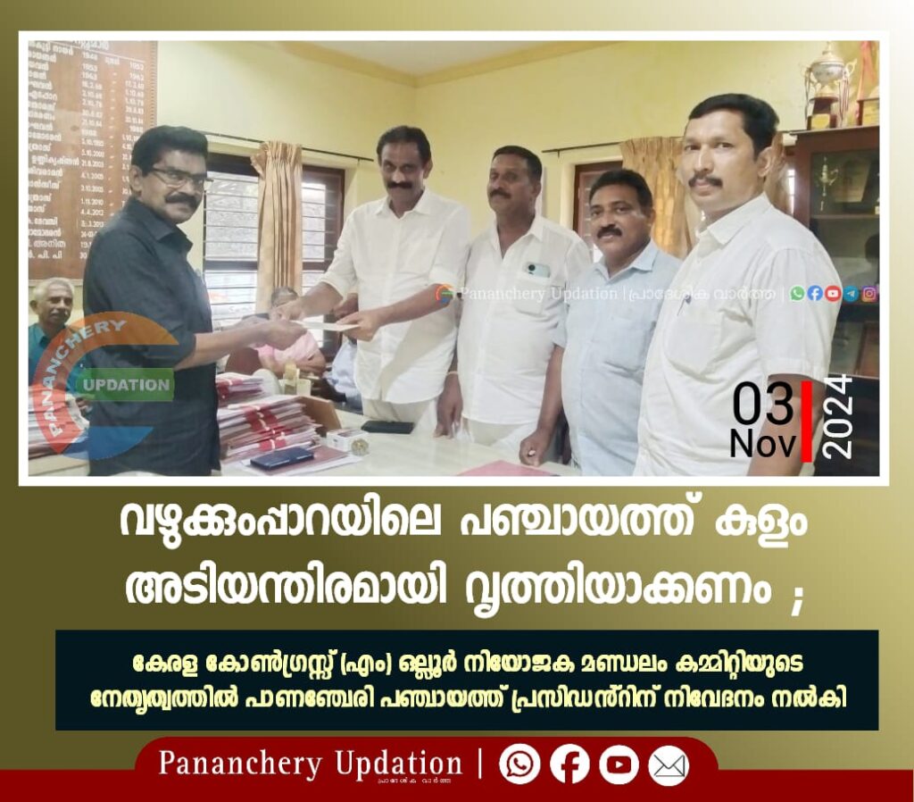 വഴുക്കുംപ്പാറയിലെ പഞ്ചായത്ത് കുളം അടിയന്തിരമായി വൃത്തിയാക്കണം ; കേരള കോൺഗ്രസ്സ് (എം) ഒല്ലൂർ നിയോജക മണ്ഡലം കമ്മിറ്റിയുടെ നേതൃത്വത്തിൽ പാണഞ്ചേരി പഞ്ചായത്ത് പ്രസിഡൻ്റിന് നിവേദനം നൽകി