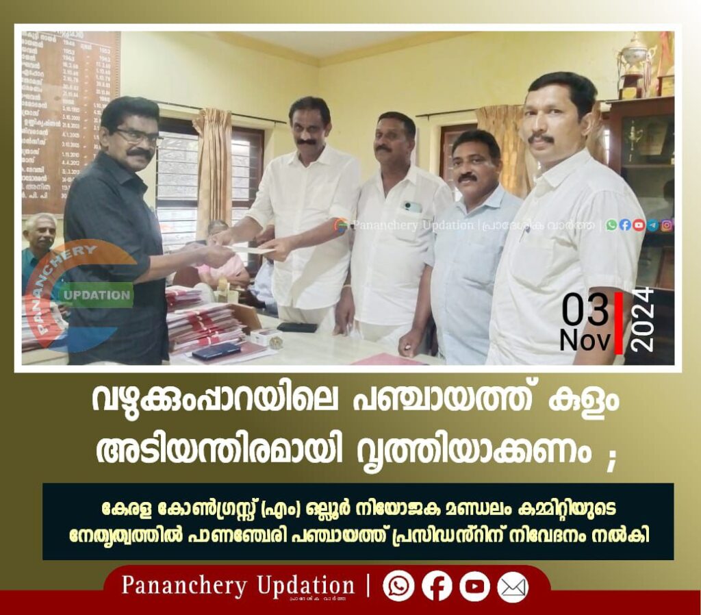 വഴുക്കുംപ്പാറ ഗ്രീൻ വാലി റോഡിന് സമീപം 45-ഓളം വീടുകൾ കുടിവെള്ളത്തിന് ആശ്രയിക്കുന്ന പഞ്ചായത്ത് കുളം രണ്ടു വർഷമായി വൃത്തിയാക്കാതെ കുളമാണോ പാടമാണോ എന്ന് തിരിച്ചറിയാത്തവിധം മലിനമായി കിടക്കുകയാണ്. ജനങ്ങൾ കുടി വെള്ളത്തിന് ആശയിക്കുന്ന ഈ കുളം എത്രയും വേഗം വൃത്തിയാക്കാൻ വേണ്ട നടപടികൾ സ്വീകരിക്കണം എന്ന് ആവശ്യപ്പെട്ടു കൊണ്ട് കേരള കോൺഗ്രസ്സ് (എം) ഒല്ലൂർ നിയോജക മണ്ഡലം കമ്മറ്റിയുടെ നേതൃത്വത്തിൽ പാണഞ്ചേരി പഞ്ചായത്ത് പ്രസിഡൻ്റിന് നിവേദനം സമർപ്പിച്ചു. കുളം വൃത്തിയാക്കാൻ വേണ്ട പ്രോജക്ട തയ്യാറാക്കി വേണ്ട നടപടികൾ സ്വീകരിക്കാം എന്ന് പ്രസിഡന്റ് ഉറപ്പ് നൽകി. ഒല്ലൂർ നിയോജക മണ്ഡലം പ്രസിഡണ്ട് ജോസ് മുതുകാട്ടിൽ