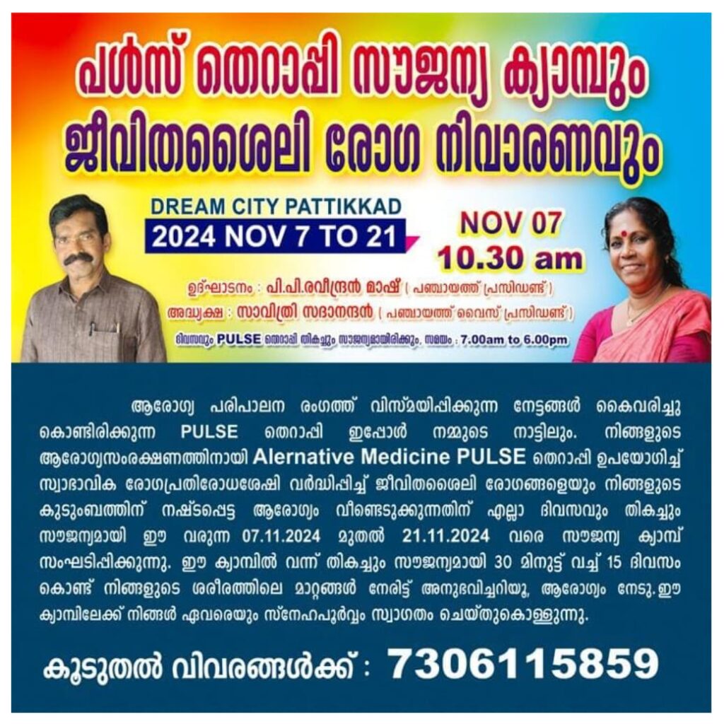 ആരോഗ്യ പരിപാലന രംഗത്ത് വിസ്മയിപ്പിക്കുന്ന നേട്ടങ്ങൾ കൈവരിച്ചു കൊണ്ടിരിക്കുന്ന PULSE തെറാപ്പി ഇപ്പോൾ നമ്മുടെ നാട്ടിലും. നിങ്ങളുടെ ആരോഗ്യസംരക്ഷണത്തിനായി Alernative Medicine PULSE തെറാപ്പി ഉപയോഗിച്ച് സ്വാഭാവിക രോഗപ്രതിരോധശേഷി വർദ്ധിപ്പിച്ച് ജീവിതശൈലി രോഗങ്ങളെയും നിങ്ങളുടെ കുടുംബത്തിന് നഷ്ടപ്പെട്ട ആരോഗ്യം വീണ്ടെടുക്കുന്നതിന് എല്ലാ ദിവസവും തികച്ചും സൗജന്യമായി ഈ വരുന്ന 07.11.2024 മുതൽ 21.11.2024 വരെ *സൗജന്യ ക്യാമ്പ് സംഘടിപ്പിക്കുന്നു.* ഈ ക്യാമ്പിൽ വന്ന് തികച്ചും സൗജന്യമായി 30 മിനുട്ട് വച്ച് 15 ദിവസം കൊണ്ട് നിങ്ങളുടെ ശരീരത്തിലെ മാറ്റങ്ങൾ നേരിട്ട് അനുഭവിച്ചറിയൂ, ആരോഗ്യം നേടു. ഈ ക്യാമ്പിലേക്ക് നിങ്ങൾ ഏവരെയും സ്നേഹപൂർവ്വം സ്വാഗതം ചെയ്തുകൊള്ളുന്നു.