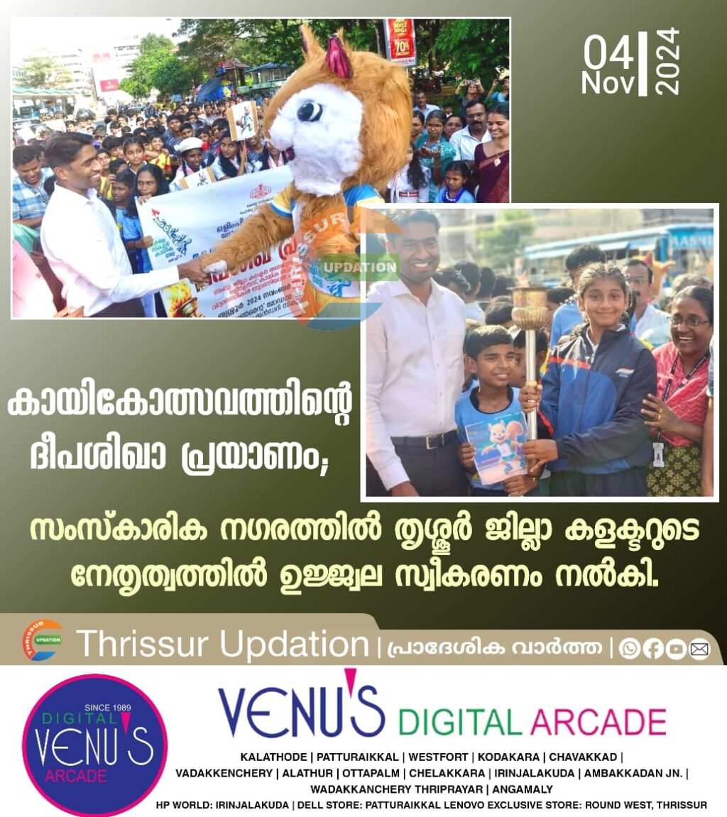 ഒളിമ്പിക്സ് മാതൃകയില് കേരളത്തില് ആദ്യമായി നടക്കുന്ന കായികോത്സവത്തിന്റെ ദീപശിഖാ പ്രയാണത്തിന് സംസ്കാരിക നഗരത്തില് ജില്ലാ കളക്ടറുടെ നേതൃത്വത്തിൽ ഉജ്ജ്വല സ്വീകരണം നൽകി നവംബര് 1 ന് കാസര്കോഡ് നിന്നും പുറപ്പെട്ട ദീപശിഖാ പ്രയാണത്തിന് തൃശ്ശൂരില് സ്വീകരണം നല്കിക്കൊണ്ട് ദീപശിഖാ ക്യപ്റ്റന് വിദ്യാഭ്യാസ വകുപ്പ് ജോയിന്റ് ഡയറക്ടര് അബൂബക്കറില്നിന്നും ദീപശിഖ ഏറ്റുവാങ്ങി ദേശീയ സോഫ്റ്റ്ബോള് താരം ഹെലന് കൈമാറി. വിദ്യാഭ്യാസ ഉപഡയറക്ടര് എ.കെ അജിതകുമാരി, ഡയറ്റ് പ്രിന്സിപ്പല് ഡോ. ശ്രീജ, വിദ്യാകിരണം കോര്ഡിനേറ്റര് രമേഷ്, എസ്.എസ്.കെ ജില്ലാ പ്രോജക്ട് ഓഫീസര് ബിനോയ്, ഐ.ടി കോര്ഡിനേറ്റര് സുഭാഷ്, ജില്ലാ വിദ്യാഭ്യാസ ഓഫീസര് ഡോ. എ. അന്സാര്, വെസ്റ്റ് ഉപജില്ലാ വിദ്യാഭ്യാസ ഓഫീസര് പി.ജെ ബിജു, മോഡല് ഗേള്സ് ഹൈസ്കൂള് പ്രധാന അധ്യാപിക ബിന്ദു എന്നിവരും സന്നിഹിതരായിരുന്നു.