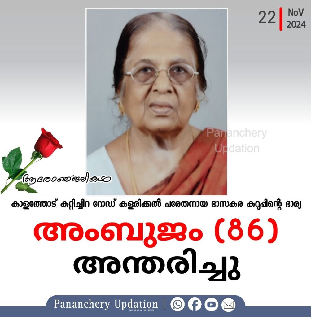 കാളത്തോട് കുറ്റിച്ചിറ റോഡ് കളരിക്കൽ പരേതനായ ഭാസകര കുറുപ്പിന്റെ ഭാര്യ അംബുജം (86) അന്തരിച്ചു. സംസ്കാരം (23.11.2024 ശനിയാഴ്ച) രാവിലെ 10-30 ന് വിട്ടുവളപ്പിൽ .മകൾ : ലതികാ ദേവി. മരുമകൻ: കെ.കെ.സുകുമാരൻ, സീനിയർ മാനേജർ (Rtd)IOB