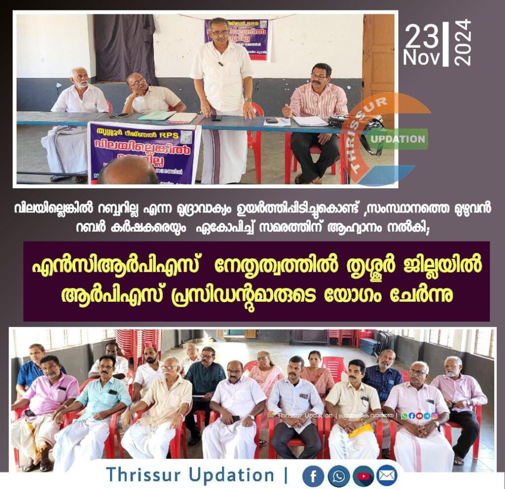 വിലയില്ലെങ്കിൽ റബ്ബറില്ല എന്ന മുദ്രാവാക്യം ഉയർത്തിപ്പിടിച്ചുകൊണ്ട് ,സംസ്ഥാനത്തെ മുഴുവൻ റബർ കർഷകരെയും സമരത്തിന് ആഹ്വാനം നൽകി, എൻസിആർപിഎസ് ദേശീയ പ്രസിഡന്റ് ആൻറണി മാസ്റ്ററിന്റെ നേതൃത്വത്തിൽ തൃശ്ശൂർ ജില്ലയിൽ ആർപിഎസ് പ്രസിഡന്റുമാരുടെ യോഗം ചേർന്നു .ജില്ലാ പ്രസിഡൻ്റ് വർഗീസ് പൂവത്തിങ്കൽ സ്വാഗതം ആശംസിച്ചു ,ജില്ലാ ട്രഷറർ പി.ഡി മാത്യു അധ്യക്ഷത വഹിച്ചു സംസാരിച്ചു . ആൻറണി മാസ്റ്റർ ഉദ്ഘാടനം നിർവഹിച്ചു. പാലക്കാട് ജില്ലാ പ്രസിഡൻ്റ് എളവമ്പാടം സൊസൈറ്റി പ്രസിഡൻ്റുമായ ബാബു പി വി സംഘടനയുടെ പ്രവർത്തനങ്ങളും തുടർ പരിപാടികളും ഇതുവരെ സംഘടന നടത്തിയിട്ടുള്ള സമരപരിപാടികളും അതിലൂടെ നേടിയെടുത്ത കാര്യങ്ങളും വ്യക്തമാക്കി സംസാരിച്ചു. യോഗത്തിൽ പങ്കെടുത്ത തൃശൂർ ജില്ലയിലെ ആർപിഎസ് പ്രസിഡന്റുമാർ വിവിധതരങ്ങളിൽ ഉള്ള ചർച്ചകളിൽ സജീവമായി പങ്കെടുത്തു . റബ്ബറിന് 200 രൂപ മിനിമം വില ലഭിച്ചില്ലെങ്കിൽ റബർ വിൽക്കേണ്ടതില്ല എന്ന തീരുമാനം കർഷകരിൽ എത്തിക്കാൻ ആർപിഎസ് പ്രസിഡന്റുമാരുടെ പരിശ്രമം ഉണ്ടാകണമെന്ന് സ്വാഗത പ്രസംഗത്തിൽ ജില്ലാ പ്രസിഡന്റ് സൂചിപ്പിച്ചു. പങ്കാളിത്തം കൊണ്ട് എൻസിആർപിഎസിന്റെ ജില്ലാ യോഗം ശ്രദ്ധേയമായിരുന്നു . പ്രസ്ഥാനത്തിൻറെ മുന്നോട്ടുള്ള വളർച്ചയിൽ കരുത്ത് പകരുന്നതിന് ഏതറ്റം വരെ പോകുന്നതിനും എന്നും കൂടെയുണ്ടായിരിക്കും എന്ന് ദേശീയ നേതൃത്വം ഉറപ്പു നൽകി എല്ലാ ആർ പി എസ് പ്രസിഡൻ്റുമാരും അവരവരുടെ ആർപിഎസുകളിൽ ഉപരോധ സമരത്തിൽ പങ്കാളികളാവുന്നതിന്റെ ആവശ്യകത ബോധ്യപ്പെടുത്തുന്നതിനും തുടർ സമരപരിപാടികളിൽ കർഷകർ പങ്കെടുക്കുന്നതിന് ആവശ്യമായ നടപടികൾ സ്വീകരിക്കുന്നതിനും ചുമതല ഏറ്റെടുത്ത് പ്രവർത്തിക്കണമെന്ന് നേതൃത്വം ആവശ്യപ്പെട്ടു. വാഴാനി ആർപിഎസ് പ്രസിഡൻ്റും എൻസിആർപിഎസിന്റെ എക്സിക്യൂട്ടീവ് കമ്മിറ്റി അംഗവുമായ സാലി പൗലോസ് നന്ദി രേഖപ്പെടുത്തി.
