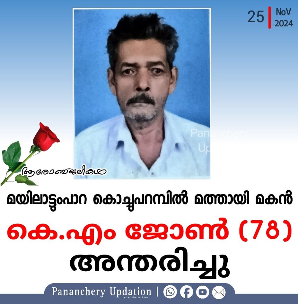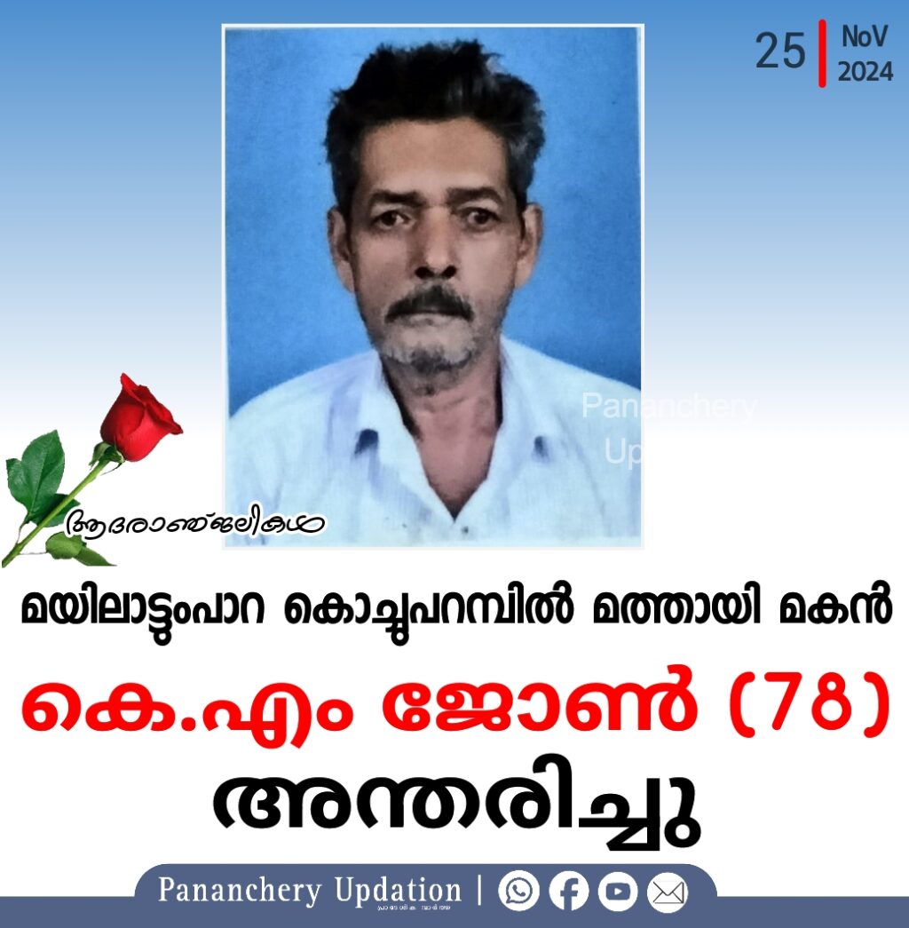 മയിലാട്ടുംപാറ കൊച്ചുപറമ്പിൽ മത്തായി മകൻ കെ.എം ജോൺ (78) അന്തരിച്ചു. സംസ്കാരം നാളെ (26-11- 2024 ചൊവ്വാഴ്ച്ച ) 3 മണിക്ക് പീച്ചി സെന്റ് ജോർജ്ജ് യാക്കോബായ സുറിയാനി പള്ളിയിൽ