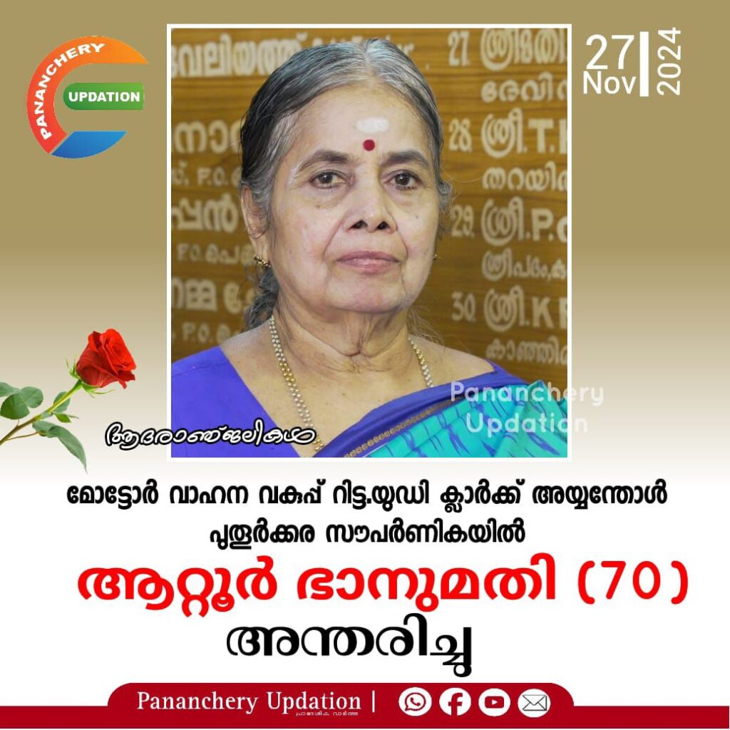 തൃശൂർ അയ്യന്തോൾ പുതൂർക്കര “സൗപർണിക” ആറ്റൂർ ഭാനുമതി (70) (Retd. UDC, മോട്ടോർ വാഹന വകുപ്പ്) അന്തരിച്ചു .ഭർത്താവ് : പരേതനായ കണ്ണത്ത് കുമാരമാരാർ (റിട്ട. സ്പെഷൽ കമ്മീഷണർ, കൊച്ചിൻ ദേവസ്വം ബോർഡ് ) ,ആറ്റൂർ ജയകുമാർ (ബാംഗ്ലൂർ) ആറ്റൂർ അഖില (യു എസ് എ) എന്നിവർ മക്കളാണ്. മരുമക്കൾ: അനുശ്രീ (ബാംഗ്ലൂർ), രാജേഷ് (യു എസ് എ). സംസ്കാരം ബാംഗ്ലൂരിലെ ചിറ ശാന്തി ധാം – ഹെബ്ബാൾ ഇലക്ട്രിക് ക്രിമറ്റോറിയത്തിൽ വ്യാഴാഴ്ച (28.11.2024) രാവിലെ നടക്കും.