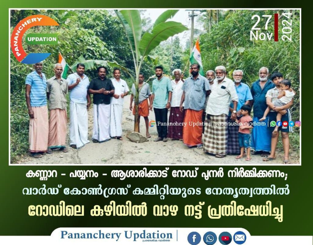 ദീർഘ നാളായി ശോചനീയാവസ്ഥയിൽ കിടക്കുന്ന കണ്ണാറ പയ്യനം ആശാരികാട് റോഡ് പുനർ നിർമ്മിക്കണമെന്ന് ആവശ്യപ്പെട്ടുകൊണ്ട് വാർഡ് കോൺഗ്രസ് കമ്മിറ്റിയുടെ നേതൃത്വത്തിൽ പയ്യനം സെന്ററിൽ പ്രതിഷേധം സംഘടിപ്പിച്ചു. കോൺഗ്രസ് നേതാക്കന്മാർ ജാഥയായി വന്നാണ് റോഡിലെ കുഴിയിൽ വാഴനട്ട് പ്രതിഷേധിച്ചത്.