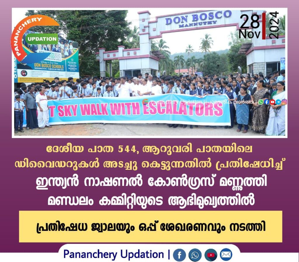 ബദൽ സംവിധാനം ഒരുക്കാതെ ദേശീയ പാത 544, ആറുവരി പാതയിലെ ഡിവൈഡറുകൾ അടച്ചു കെട്ടുന്നതിൽ പ്രതിഷേധിച്ച് ഇന്ത്യൻ നാഷണൽ കോൺഗ്രസ് മണ്ണുത്തി മണ്ഡലം കമ്മിറ്റിയുടെ ആഭിമുഖ്യത്തിൽ പ്രതിഷേധ ജ്വാലയും ഒപ്പ് ശേഖരണവും നടത്തി മുല്ലക്കര ഡോൺ ബോസ്കോ സ്കൂൾ പരിസരത്ത് വെച്ച് എം.പി.വിൻസന്റ് എക്സ് എംഎൽഎ ഉദ്ഘാടനം നിർവഹിച്ചു . മണ്ഡലം പ്രസിഡന്റ് എം.യു.മുത്തു അധ്യക്ഷത വഹിച്ചു ആറുവരിപ്പാത നിർമ്മാണത്തിന്റെ സർവ്വേ നടക്കുന്ന സമയത്ത് തന്നെ മുളയം റോഡിൽ അടിപ്പാതയും ഡോൺ ബോസ്കോ സ്കൂളിന്റെ മുമ്പിൽ സ്കൈവാക്കും നിർമ്മിക്കണമെ നുള്ള ആവശ്യം അംഗീകരിക്കപ്പെട്ടിട്ടുള്ളതാണ്, ആവശ്യങ്ങൾ നടപ്പിലാക്കുന്നത് വരെ പൊതുജനങ്ങളെ മുന്നിൽ നിർത്തി സമരം ശക്തമാക്കുമെന്ന് എം.പി. വിൻസന്റ് പറഞ്ഞു
