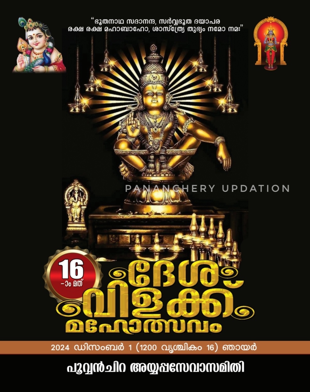 പൂവ്വൻചിറ അയ്യപ്പസേവാസമിതിയുടെ 16 -ാം മത് ദേശവിളക്ക് മഹോത്സവം 2024 ഡിസംബർ 1 ന്. ദേശവിളക്ക് മഹോത്സവം സുരേഷ് ശാന്തിയുടെ മുഖ്യകാർമികത്വത്തിൽ നടത്തുന്നു. രാവിലെ 5.30 ന് ഗണപതിഹോമം, രാവിലെ 8.00 ന് – കെട്ടുനിറ , വൈകീട്ട് 5.30 ന് എഴുന്നളളിപ്പ് (SNDP ഗുരുദേവ ക്ഷേത്രത്തിൽ നിന്ന്) , വൈകീട്ട് 6.00 ന് ദീപാരാധന ,രാത്രി 8.00 ന് അത്താഴപൂജ ,രാത്രി 8.30 ന് അന്നദാനം തുടർന്ന് പന്തലിൽ ശാസ്താംപാട്ട് ആനന്ദകുമാർ അരിമ്പൂരിൻ്റെ നേതൃത്വത്തിലും ചിന്ത് പാട്ട് ശക്തിവേൽ കാവടിചിന്ത് ചിറ്റിശ്ശേരിയുടെയും നേതൃത്വത്തിൽ നടത്തും.