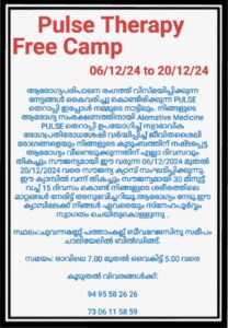 ആരോഗ്യപരിപാലന രംഗത്ത് വിസ്മയിപ്പിക്കുന്ന നേട്ടങ്ങൾ കൈവരിച്ചു കൊണ്ടിരിക്കുന്ന *PULSE തെറാപ്പി* ഇപ്പോൾ നമ്മുടെ നാട്ടിലും. നിങ്ങളുടെ ആരോഗ്യ സംരക്ഷണത്തിനായി Alernative Medicine PULSE തെറാപ്പി ഉപയോഗിച്ച് സ്വാഭാവിക രോഗപ്രതിരോധശേഷി വർദ്ധിപ്പിച്ച് ജീവിതശൈലി രോഗങ്ങളെയും നിങ്ങളുടെ കുടുംബത്തിന് നഷ്ടപ്പെട്ട ആരോഗ്യം വീണ്ടെടുക്കുന്നതിന് എല്ലാ ദിവസവും തികച്ചും സൗജന്യമായി ഈ വരുന്ന *06/12/2024 മുതൽ 20/12/2024 വരെ സൗജന്യ ക്യാമ്പ് സംഘടിപ്പിക്കുന്നു.* ഈ ക്യാമ്പിൽ വന്ന് തികച്ചും സൗജന്യമായി 30 മിനുട്ട് വച്ച് 15 ദിവസം കൊണ്ട് നിങ്ങളുടെ ശരീരത്തിലെ മാറ്റങ്ങൾ നേരിട്ട് അനുഭവിച്ചറിയൂ.ആരോഗ്യം നേടു.ഈ ക്യാമ്പിലേക്ക് നിങ്ങൾ ഏവരെയും സ്നേഹപൂർവ്വം സ്വാഗതം ചെയ്തുകൊള്ളുന്നു .