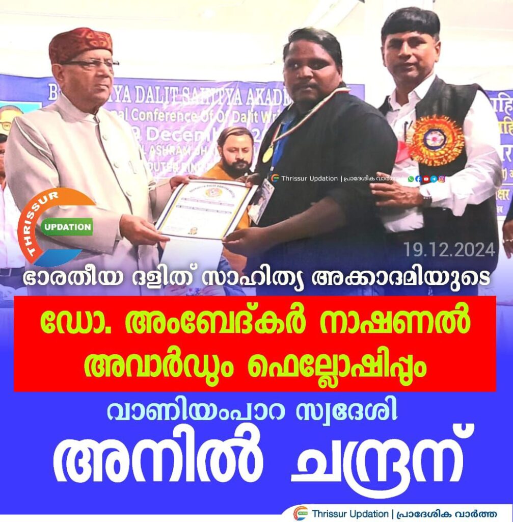 ഭാരതീയ ദളിത് സാഹിത്യ അക്കാദമിയുടെ ഡോ. അംബേദ്കർ നാഷണൽ അവാർഡും ഫെല്ലോഷിപ്പും വാണിയംപാറ സ്വദേശി അനിൽ ചന്ദ്രന്.Dr. BR അബേദ്ക്കർ ദളിത് സാഹിത്യ അക്കാദമി 2024 നാഷണൽ അവാർഡും ഫെല്ലോഷിപ്പും ന്യൂഡൽഹി പഞ്ചശീൽ ആശ്രമത്തിലെ അംബേദ്ക്കർ മണ്ഡപത്തിൽ നടന്ന ദളിത് സാഹിത്യ അക്കാദമിയുടെ നാൽപ്പതാമത് സമ്മേളനത്തിൽവെച്ച് ഭാരതീയ ദളിത് സാഹിത്യ അക്കാദമി ദേശീയ പ്രസിഡന്റ് ഡോ. എസ്. പി. സുമൻഷകർ അവാർഡ് സമ്മാനിച്ചു.നാടൻ പാട്ടിനും 15 വയസ്സിന് താഴെയുള്ള കുട്ടികളുടെ ട്രൂപ്പും പരിഗണിച്ചാണ് അവാർഡ് ലഭിച്ചത്. കല, സാഹിത്യം, സാമൂഹ്യപ്രവർത്തനം എന്നീ മേഖലകളിലെ പ്രതിഭകൾക്കാണ് ദളിത് സാഹിത്യ അക്കാദമി ഡോ. അംബേദ്കർ നാഷണൽ അവാർഡ് ഏർപ്പെടുത്തിയത്.വാണിയമ്പാറ , മണിയൻ കിണർ കുന്നുംപുറത്ത് വീട്ടിൽ ചന്ദ്രൻ , തങ്കമണി ദമ്പതികളുടെ മകനാണ് അനിൽ ചന്ദ്രൻ ആർ സി.