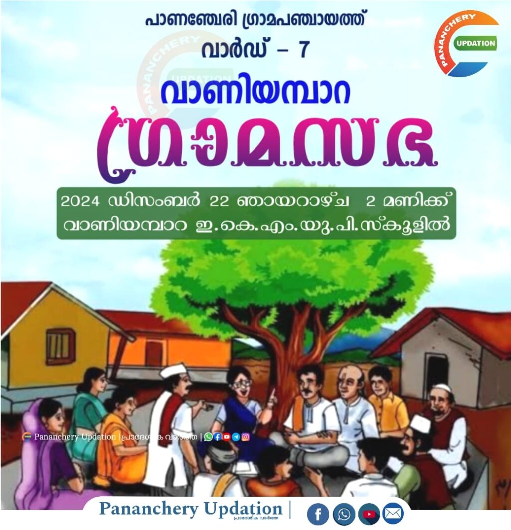 പാണഞ്ചേരി ഗ്രാമപഞ്ചായത്ത് ജനകീയാസൂത്രണം 2025-26 വാർഷികപദ്ധതി തയ്യാറാക്കുന്നതിന്റെ ഭാഗമായി വർക്കിംഗ് ഗ്രൂപ്പുകൾ തയ്യാറാക്കിയ കരട് നിർദ്ദേശങ്ങൾ ചർച്ച ചെയ്ത് അന്തിമമാക്കുന്നതിനും തൊഴിലുറപ്പ് ആക്ഷൻ പ്ലാൻ, ലേബർ ബഡ്ജറ്റ് എന്നിവ അംഗീകരിക്കുന്നതിനുമുള്ള 7-ാം വാർഡ് ഗ്രാമസഭായോഗം 2024 ഡിസംബർ 22 -ാം തീയതി ഞായറാഴ്ച ഉച്ചതിരിഞ്ഞ് 2 മണിക്ക് വാണിയമ്പാറ E.K.M. യു.പി. സ്കൂളിൽ വെച്ച് ചേരുന്നു എന്ന് വാർഡ് മെമ്പർ സുബൈദ അബൂബക്കർ അറിയിച്ചു.