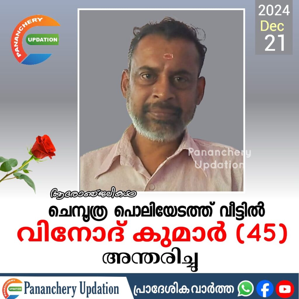 ചെമ്പൂത്ര പൊലിയേടത്ത് വീട്ടിൽ വിനോദ് കുമാർ (45) അന്തരിച്ചു.