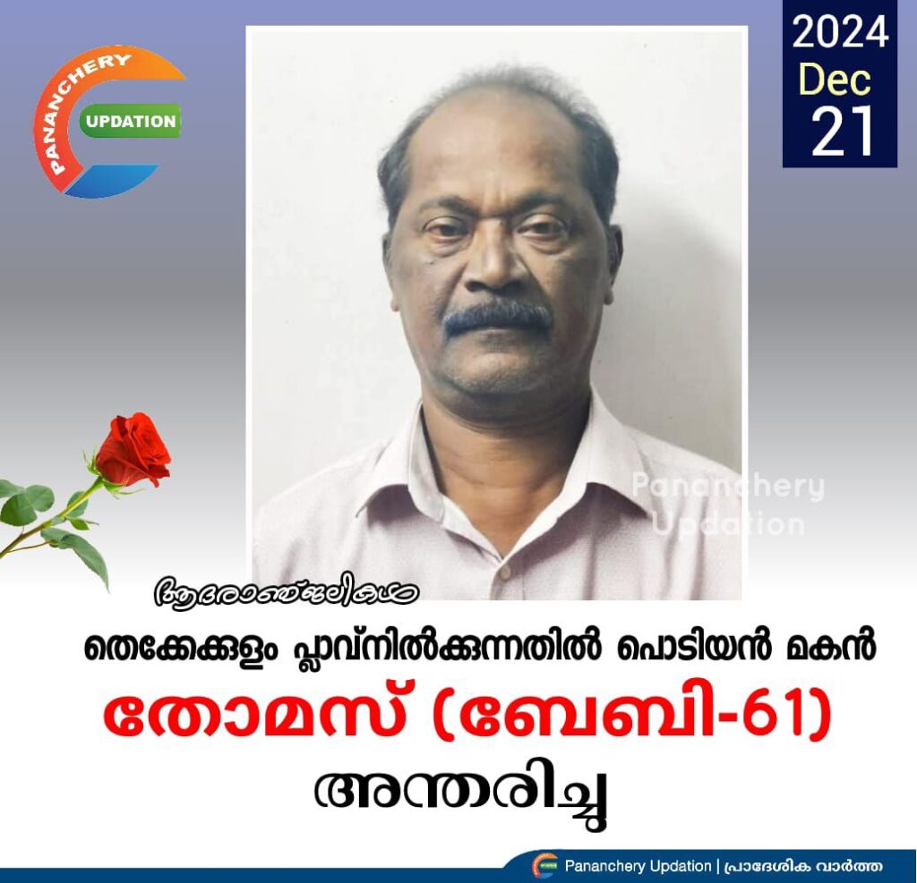 പീച്ചി തെക്കേക്കുളം പ്ലാവ്നിൽക്കുന്നതിൽ പൊടിയൻ മകൻ തോമസ് (ബേബി-61) അന്തരിച്ചു. സംസ്കാരം ഇന്ന് (21.12.2024 ശനി) ഉച്ചകഴിഞ്ഞ് 3 മണിക്ക് വിലങ്ങന്നൂർ സെൻ്റ് ജോർജ് മലങ്കര കത്തോലിക്ക പള്ളിയിൽ. ഭാര്യ: ബീന. മക്കൾ: ആൽബിൻ, അൽന.