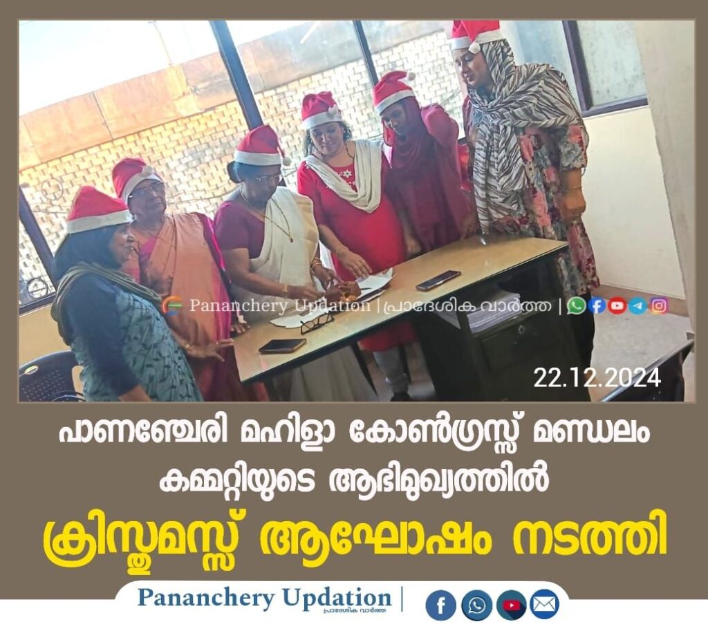 പാണഞ്ചേരി മഹിളാ കോൺഗ്രസ്സ് മണ്ഡലം കമ്മറ്റിയുടെ ആഭിമുഖ്യത്തിൽ ക്രിസ്തുമസ്സ് ആഘോഷം നടത്തി. പാണഞ്ചേരി മഹിളാ കോൺഗ്രസ്സ് മണ്ഡലം കമ്മറ്റിയുടെ ആഭിമുഖ്യത്തിൽപാർട്ടി ഓഫീസിൽ യോഗം ചേർന്നു. മണ്ഡലം പ്രസിഡന്റ് ഫസീല നിഷാദ് അദ്ധ്യക്ഷത വഹിച്ച യോഗം മുൻ ജില്ല പ്രസിഡന്റ് ലീലാമ്മ ടീച്ചർ കേക്ക് മുറിച്ചു ഉദ്ഘാടനം ചെയ്തു.ബ്ലോക്ക് പ്രസിഡന്റ് മിനി നിജോ മുഖ്യപ്രഭാഷണം നടത്തി. സുശീല ടീച്ചർ, ഷീല വർഗീസ് ഹസീന മനാഫ് ബീവാത്തു, തുടങ്ങിയവർ സംസാരിച്ചു.