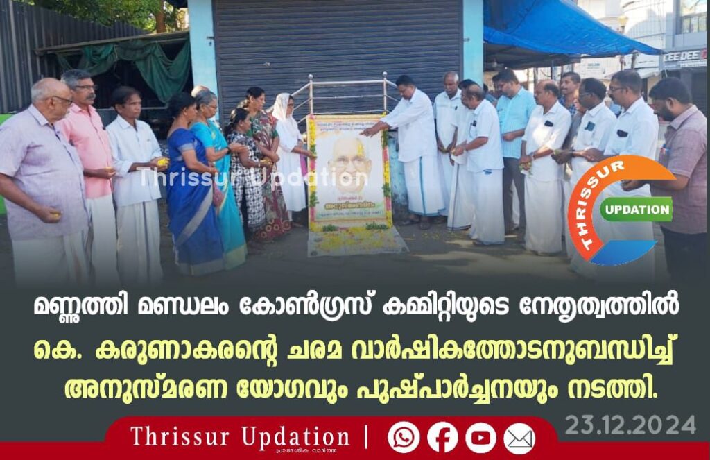 മണ്ണുത്തി മണ്ഡലം കോൺഗ്രസ് കമ്മിറ്റിയുടെ നേതൃത്വത്തിൽ കെ. കരുണാകരൻ്റെ ചരമ വാർഷികത്തോടനുബന്ധിച്ച് അനുസ്മരണ യോഗവും പുഷ്പാർച്ചനയും നടത്തി.