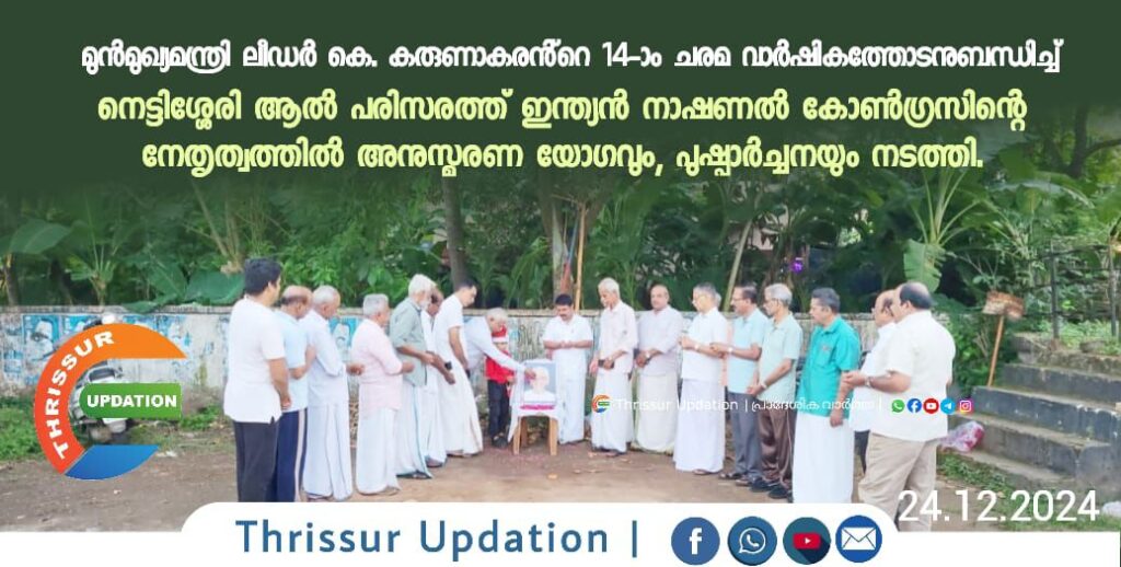 മുൻമുഖ്യമന്ത്രി ലീഡർ കെ. കരുണാകരൻ്റെ 14-ാം ചരമ വാർഷികത്തോടനുബന്ധിച്ച് നെട്ടിശ്ശേരി ആൽ പരിസരത്ത് ഇന്ത്യൻ നാഷണൽ കോൺഗ്രസിന്റെ നേതൃത്വത്തിൽ അനുസ്മരണ യോഗവും, പുഷ്പാർച്ചനയും നടത്തി. ഒല്ലൂക്കര മണ്ഡലം കോൺഗ്രസ്സ് കമ്മറ്റി പ്രസിഡൻ്റ് കെ.ഗോപാലകൃഷ്ണൻ അനുശോചന യോഗം പുഷ്പാർച്ചന നടത്തി ഉദ്ഘാടനം നിർവഹിച്ചു. യൂത്ത് കോൺഗ്രസ് നേതാവ് ജെൻസൻ ജോസ് കാക്കശ്ശേരി അദ്ധ്യക്ഷത വഹിച്ചു. മുൻ മേജർ സുബൈദാർ കെ.കെ. ഉണ്ണികൃഷ്ണൻ മുഖ്യപ്രഭാഷണം നടത്തി. എൻ.പി.രാമചന്ദ്രൻ, അനിൽകുമാർ തെക്കൂട്ട്, യു.വിജയൻ, എച്ച്.ഉദയകുമാർ, പി.എം.സുലൈമാൻ, ശശി നെട്ടിശ്ശേരി, ടി.ശ്രീധരൻ, ചന്ദ്രൻ വെളുത്തേടത്ത്, സണ്ണി രാജൻ, സി.പഴനിമല, ചന്ദ്രൻ കോച്ചാട്ടിൽ, ടി.എസ്.ബാലൻ, വിപിൻ നെട്ടിശ്ശേരി എന്നിവർ പ്രസംഗിച്ചു.