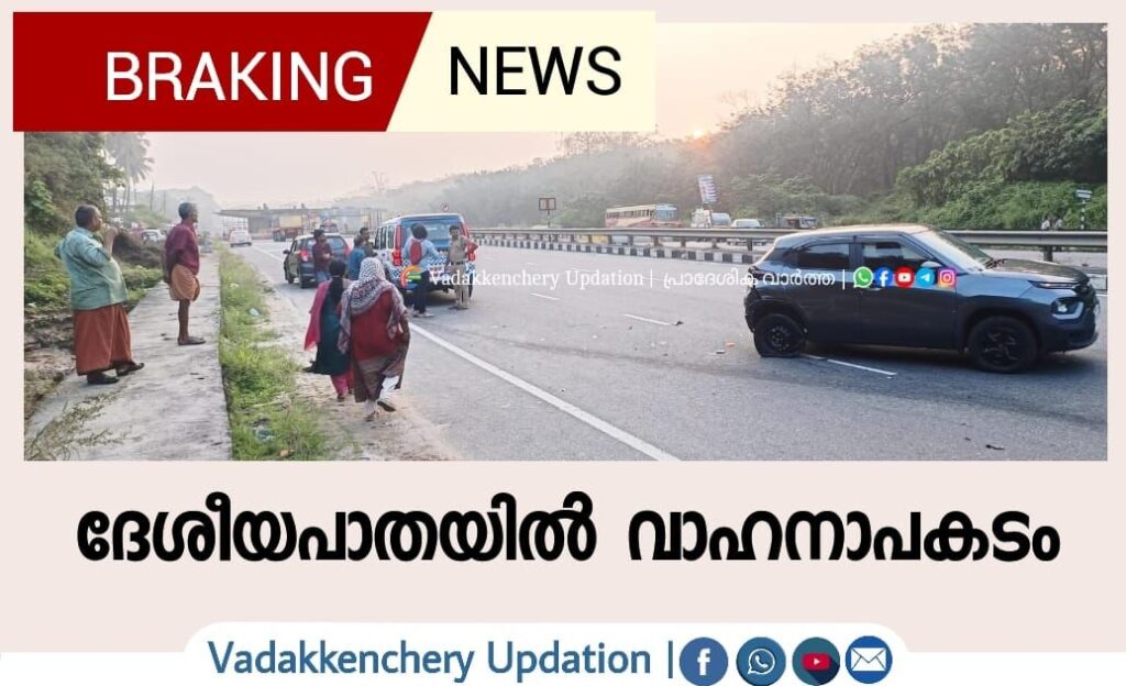 ദേശീയപാത മേലേചുങ്കത്ത് വാഹനാപകടം . ആലത്തൂർ ഭാഗത്തേയ്ക്ക് പോകുന്ന മാരുതി കാർ അതേ ദിശയിൽ പോകുന്ന ടാറ്റാ യുടെ കാറിൽ ഇടിക്കുകയായിരുന്നു.അപകടത്തിൽ ആർക്കും പരിക്കില്ല. ഹൈവേ പോലീസും ഹൈവേ എമർജൻസി ടീം ഉം എത്തി വേണ്ട നടപടികൾ സ്വീകരിച്ചു. കലാത്ത് ഏഴ് മണിയ്ക്കാണ് അപകടം നടന്നത്. ഇടിയുടെ ആഘാതത്തിൽ കാർ എതിർ ദിശയിലേക്ക് തിരിഞ്ഞ് നിന്നു.