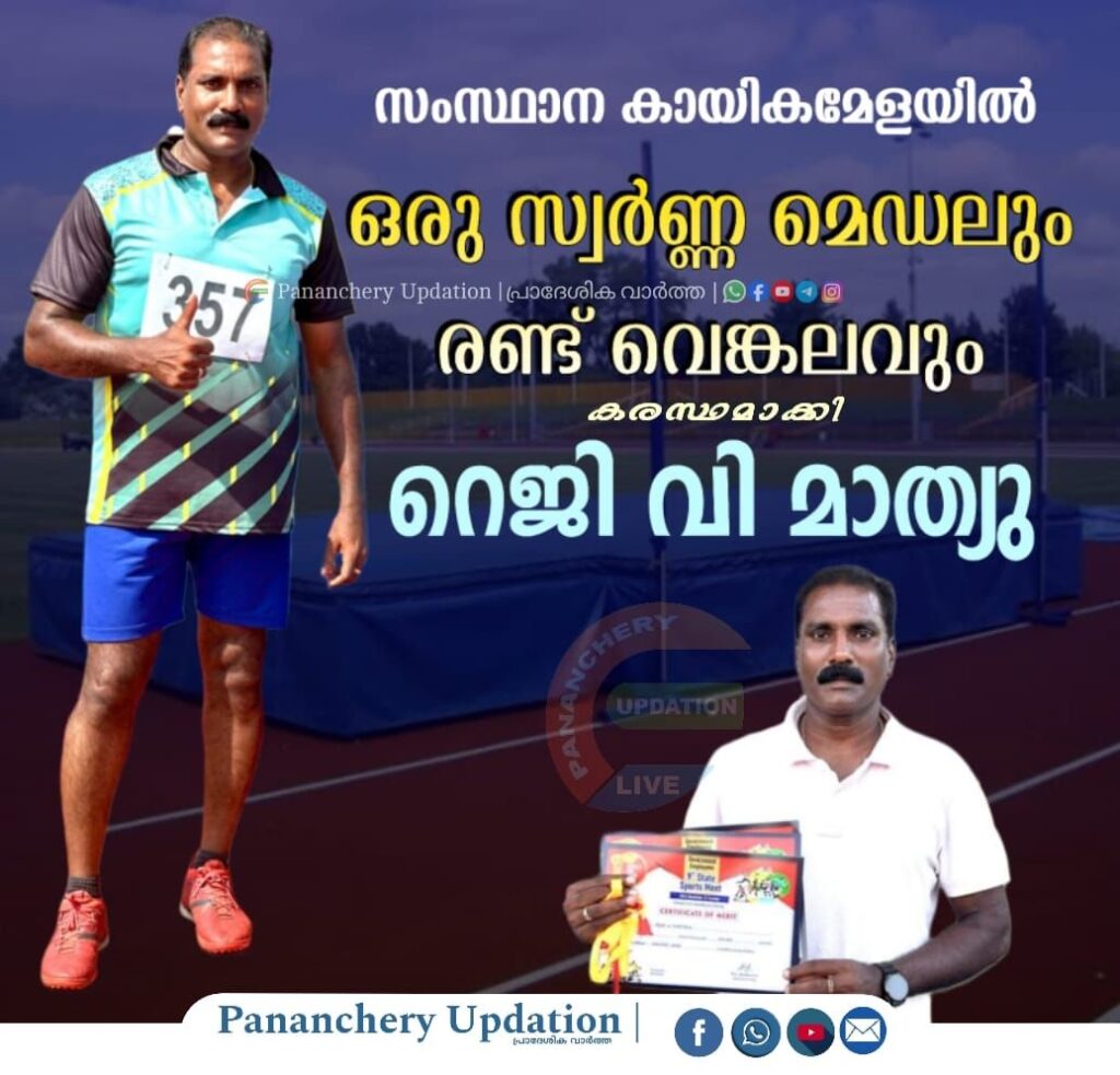 എറണാകുളം മഹാരാജാസ് കോളേജ് സ്റ്റേഡിയത്തിൽ വച്ച് നടന്ന സർക്കാർ ജീവനക്കാരുടെ സംസ്ഥാന തല കായികമേളയിൽ പങ്കെടുത്ത് ഹൈജംമ്പ്,ട്രിപ്പിൽജംമ്പ്,ഡിസ്കസ്ത്രോ ഇനങ്ങളിൽ ഒരു സ്വർണവും രണ്ട് വെങ്കലവും മെഡലുകൾ കരസ്ഥമാക്കി റെജി വി മാത്യു നേട്ടം കൈവരിച്ചു. ഒല്ലൂക്കര പ്രാഥമിക ആരോഗ്യ കേന്ദ്രത്തിലെ ജൂനിയർ ഹെൽത്ത് ഇൻസ്പെക്ടറാണ്. ജില്ലാ കായിക മേളയിൽ മൂന്ന് ഗോൾഡ് മെഡലുകൾ നേടി വ്യക്തിഗത ചാമ്പ്യൻഷിപ് നേടിയിരുന്നു. പണഞ്ചേരി പഞ്ചായത്ത് ആയോട് നിവാസിയാണ്.