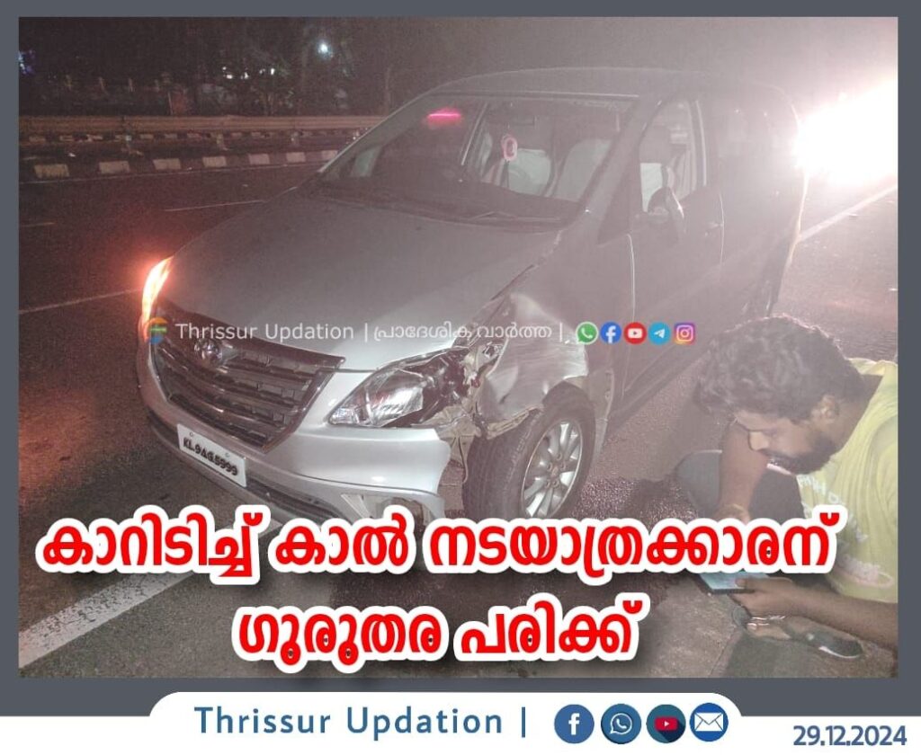 ദേശീയപാതയിൽ കൊമ്പഴ വെച്ച് റോഡ് മുറിച്ച് കടക്കുന്നതിനിടെ കൊമ്പഴ സ്വദേശി പോളിന് പരിക്കേറ്റു .കൊമ്പഴ സെന്റ് ജോസഫ് പള്ളിയിലെ കപ്യാർ പോളിനാണ് പരിക്കേറ്റത്. ഇയാളെ ഉടൻ തന്നെ 108 ആംബുലൻസിൽ ഇദ്ദേഹത്തെ തൃശൂരിലെ സ്വകാര്യ ആശുപത്രിയിൽ പ്രവേശിപ്പിച്ചു. പട്ടിക്കാട് ഭാഗത്ത് നിന്നും വടക്കഞ്ചേരി ഭാഗത്തേക്ക് പോകുന്ന ഇന്നോവ കാർ ആണ് ഇടിച്ചത്. വൈകീട്ട് ഏഴ് മണിയോടെയാണ് അപകടം നടന്നത്. ഈ ഭാഗത്ത് തീരെ വെളിച്ചം ഇല്ലാത്തതിനാൽ ആണ് അപകടം നടന്നത്.വളവുള്ള പ്രദേശത്ത് ദേശീയപാതയോരത്ത് വളരുന്ന ചെടികൾ കാഴ്ചമറയ്കുന്നതായും പലപ്പോഴും നാട്ടുകാർ ചേർന്ന് പ്രദേശം വൃത്തിയാക്കാറുള്ളതായും അവർ പറഞ്ഞു.