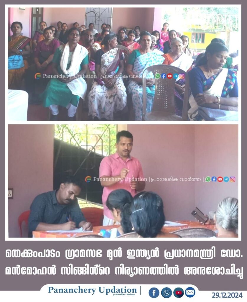 തെക്കുംപാടം ഗ്രാമ സഭ മുൻ ഇന്ത്യൻ പ്രധാനമന്ത്രിയും നവ സാമ്പത്തിക നയങ്ങളുടെ ശില്പിയുമായ ഡോ. മൻമോഹൻ സിങ്ങിൻ്റെ നിര്യാണത്തിൽ അനുശോചനം രേഖപ്പെടുത്തി. അടച്ചിട്ട ഇന്ത്യൻ സാമ്പത്തിക രംഗത്തിൻ്റെ വാതിലുകൾ വിദേശ മൂലധന നിക്ഷേപത്തിനായി തുറന്ന് നൽകിയതിലൂടെ ഇന്ത്യൻ സാമ്പത്തിക രംഗത്തെ വിപ്ലവകരമായ മാറ്റങ്ങൾക്ക് തുടക്കം കുറിച്ച സാമ്പത്തിക ശാസ്ത്രഞ്ജനാണ് ഡോ. മൻഹോൻസിങ്ങെന്ന് അനുശോചന പ്രഭാഷണത്തിൽ പഞ്ചായത്തംഗം അനീഷ് മേക്കര പറഞ്ഞു.
