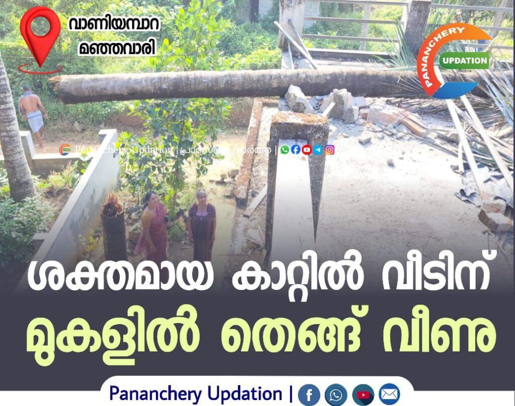 ശക്തമായ കാറ്റിൽ വീടിന് മുകളിൽ തെങ്ങ് വീണു.വാണിയമ്പാറ മഞ്ഞവാരി എലിഞ്ഞേരി വീട്ടിൽ സത്യഭാമയുടെ വീടിൻറെ മുകളിലാണ് ഇന്നലെ 9 മണിയോടുകൂടി വീശീയ കാറ്റിൽ തെങ്ങ് മുറിഞ്ഞ് വീടിന് മുകളിൽ വീണത്.വീടിൻറെ ടെറസിന് വിള്ളലുകൾ സംഭവിക്കുകയും പാരപെറ്റിൻ്റെ പകുതിഭാഗം തകരുകയും ചെയ്തു. ടെറസ് വീടിൻറെ മുകൾഭാഗത്ത് തെങ്ങ് വീണതിനാലാണ് വൻ അപകടം ഒഴിവായത്. അപകട സമയത്ത് സത്യഭാമയും മകനും വീടിനകത്ത് ഉണ്ടായിരുന്നു. സമീപത്ത്’തന്നെ മറ്റു വീടും പഞ്ചായത്ത് റോഡും പോകുന്നുണ്ട് .വാർഡ് മെമ്പർ ഷീല അലക്സ് അപകടസ്ഥലം സന്ദർശിച്ചു.